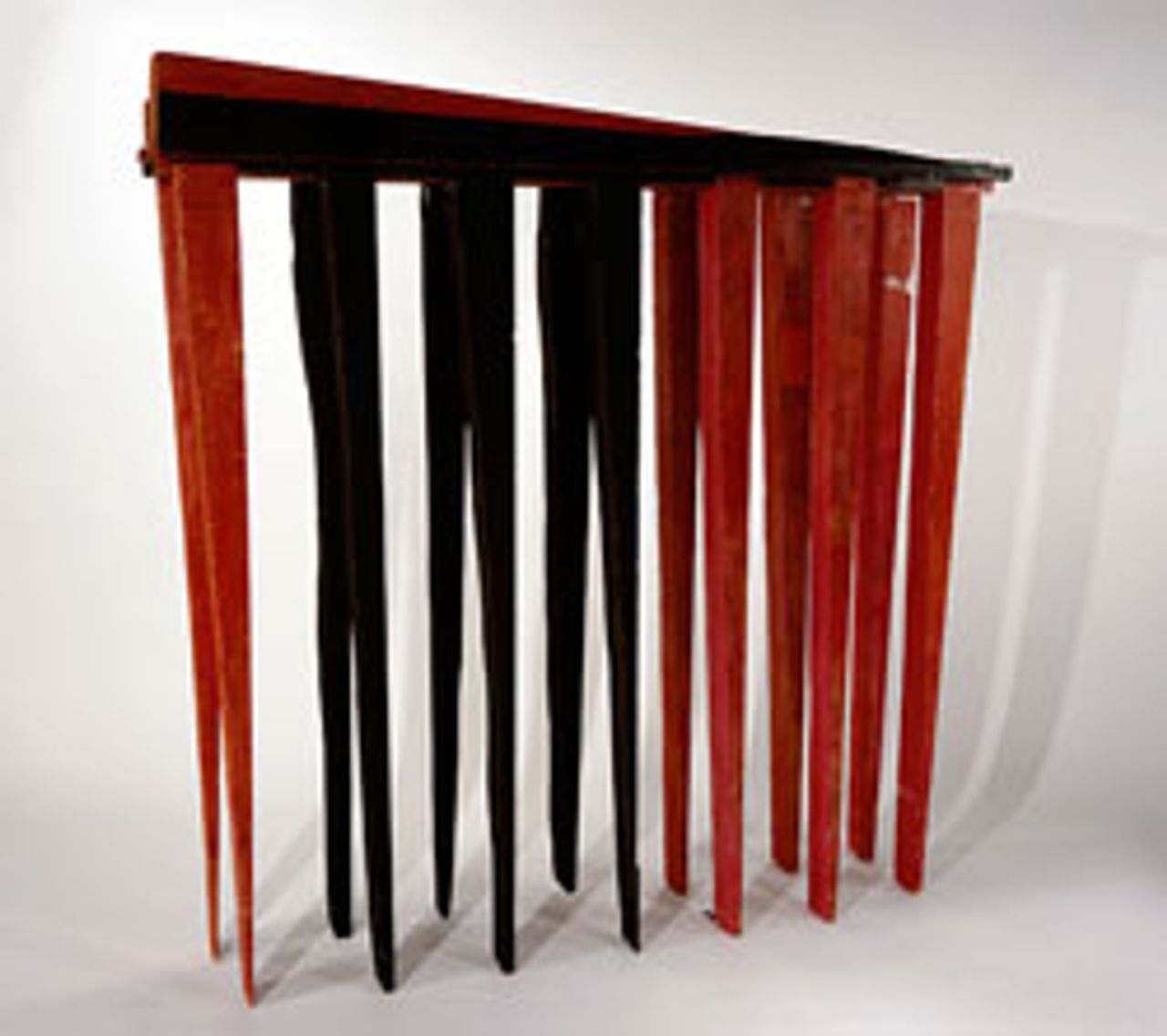 "The Blind Leading the Blind" (1947) consists of a series of regimented wooden legs reducing to a point held together by a piece of wood across the top. Bourgeois locates the source of the image in a childhood memory linked to hiding under the kitchen table and seeing her parents' legs crisscrossing with the table legs while they prepared a meal, "What are they doing? What is their game? What is their purpose? How do I relate to them? And in the end I considered that they were not friendly, I decided that the outside was not friendly."
