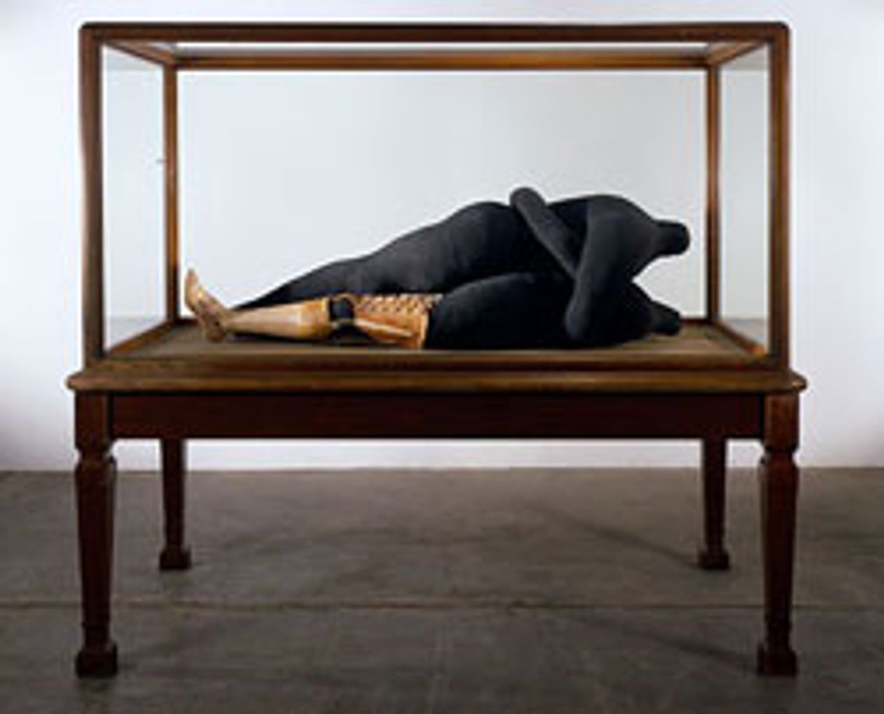 Bourgeois's more recent works include a series of fabric heads and figures in varying states of anguish and despair. In "Couple IV" (1997), what looks like an old wood and glass display cabinet from a provincial museum displays two headless fabric bodies attempting to make love, but there is an emotional distance between the two. Bourgeois explains this piece as her confusion as a child after accidentally witnessing her parents making love, but the overriding sensation is of failure in general.