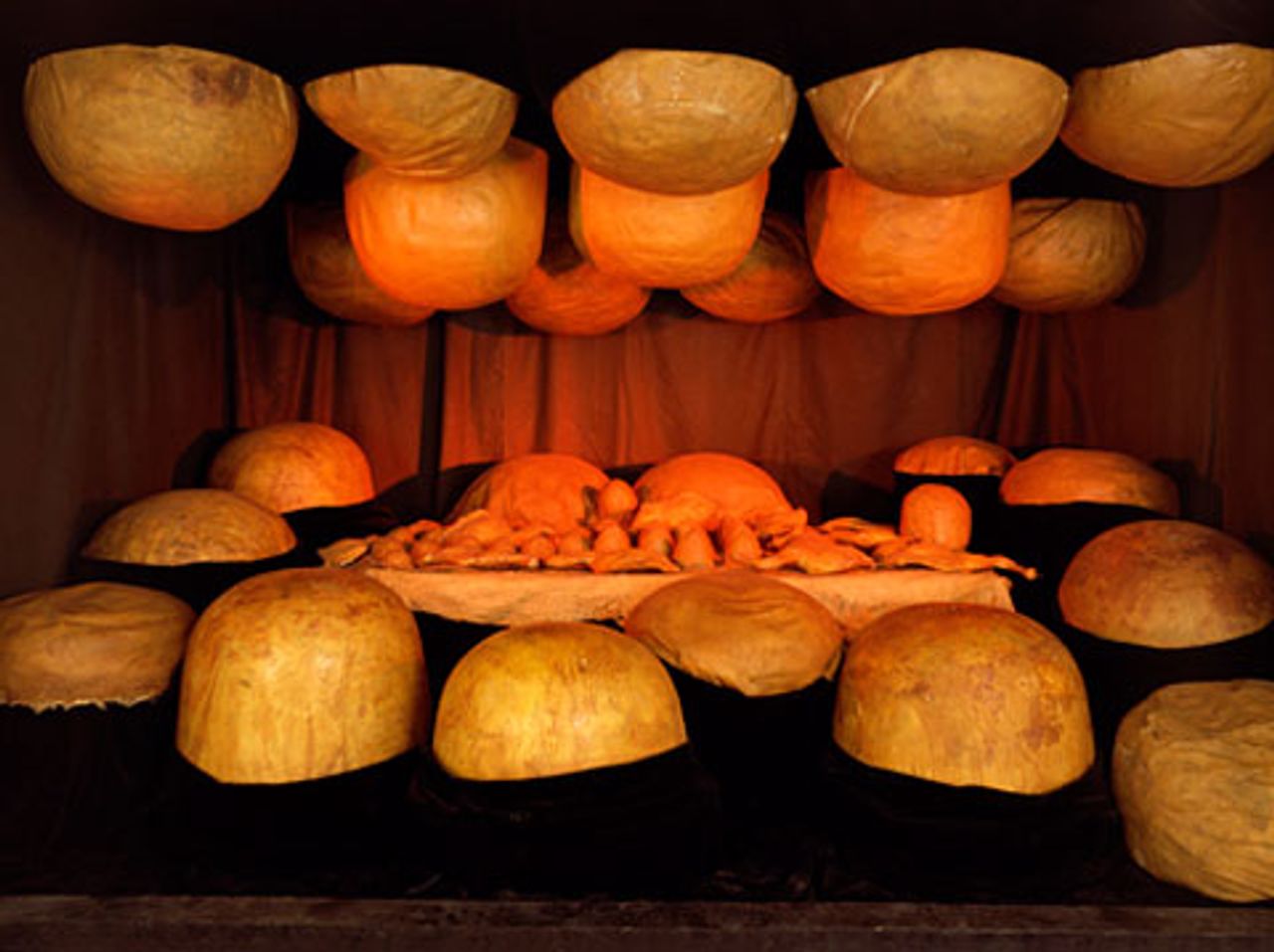 One of her major works from the end of this period is "Destruction of the Father" (1974), depicting a cave-like structure in which primitively-shaped rock-like figures surround a sacrificial slab, observing with a cold indifference the severed body parts scattered across it (real joints of lamb bought at a local butcher's shop). It is a very disturbing work, which is reminiscent of the work of one of Bourgeois's favorite artists, the 18th century Spaniard Francisco Goya.