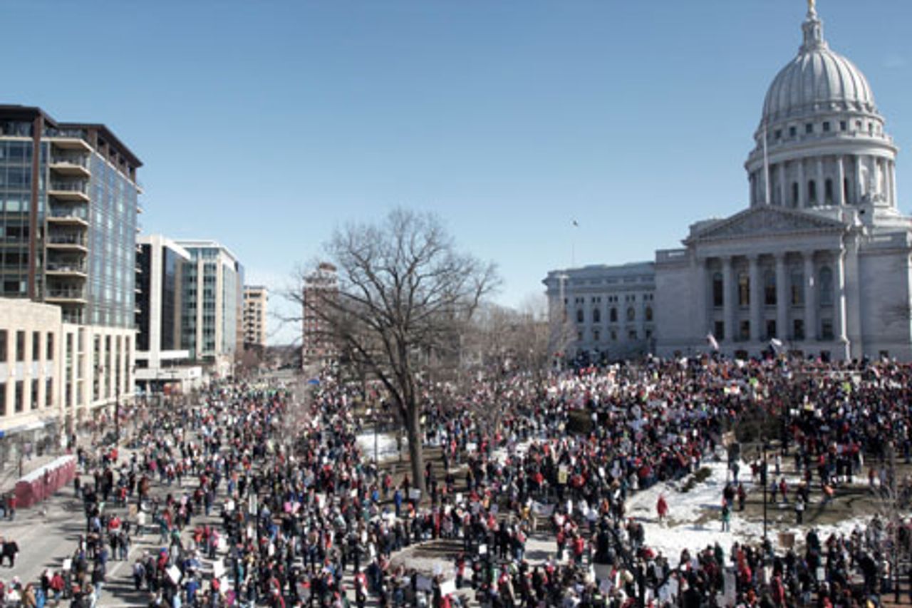 Tens of thousands have descended on Madison to protest the plan by the newly elected Republican governor to close a $3.6 billion budget deficit over the next two years through draconian cuts in social services, including a $900 million cut in public education, and imposing a de facto 20 percent wage cut for public employees who will be forced to pay larger deductions for their pension and health care plans.