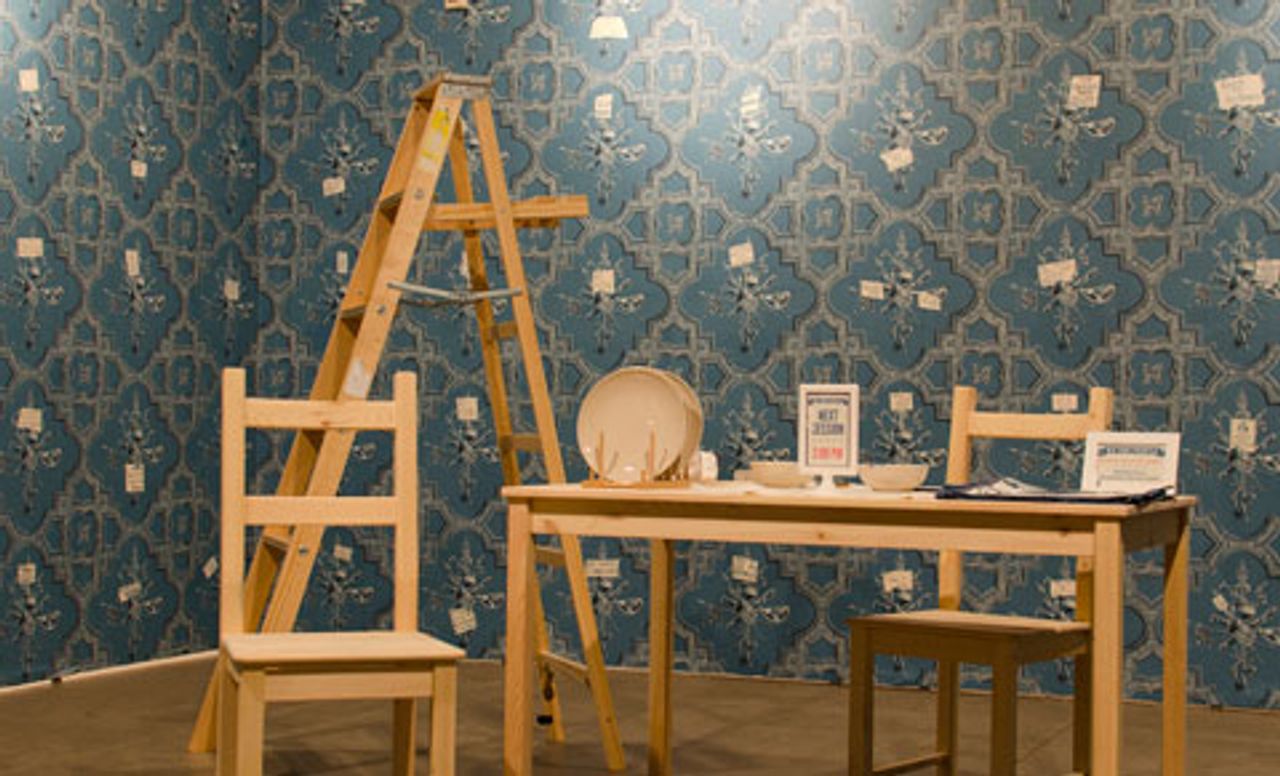Artist Lauren Adams, working with the Contemporary Art Museum St. Louis, presented the installation We the People, perhaps the most overtly political commentary on display. Three walls of seductive patterned blue wallpaper, reproduced from the Revolutionary War era, have signs within the pattern bearing carefully hand-painted slogans from both Occupy Wall Street and Tea Party protests, functioning as a “generalized call to action” and reflection of the anger and tension in American society, some of it finding quite a reactionary outlet.