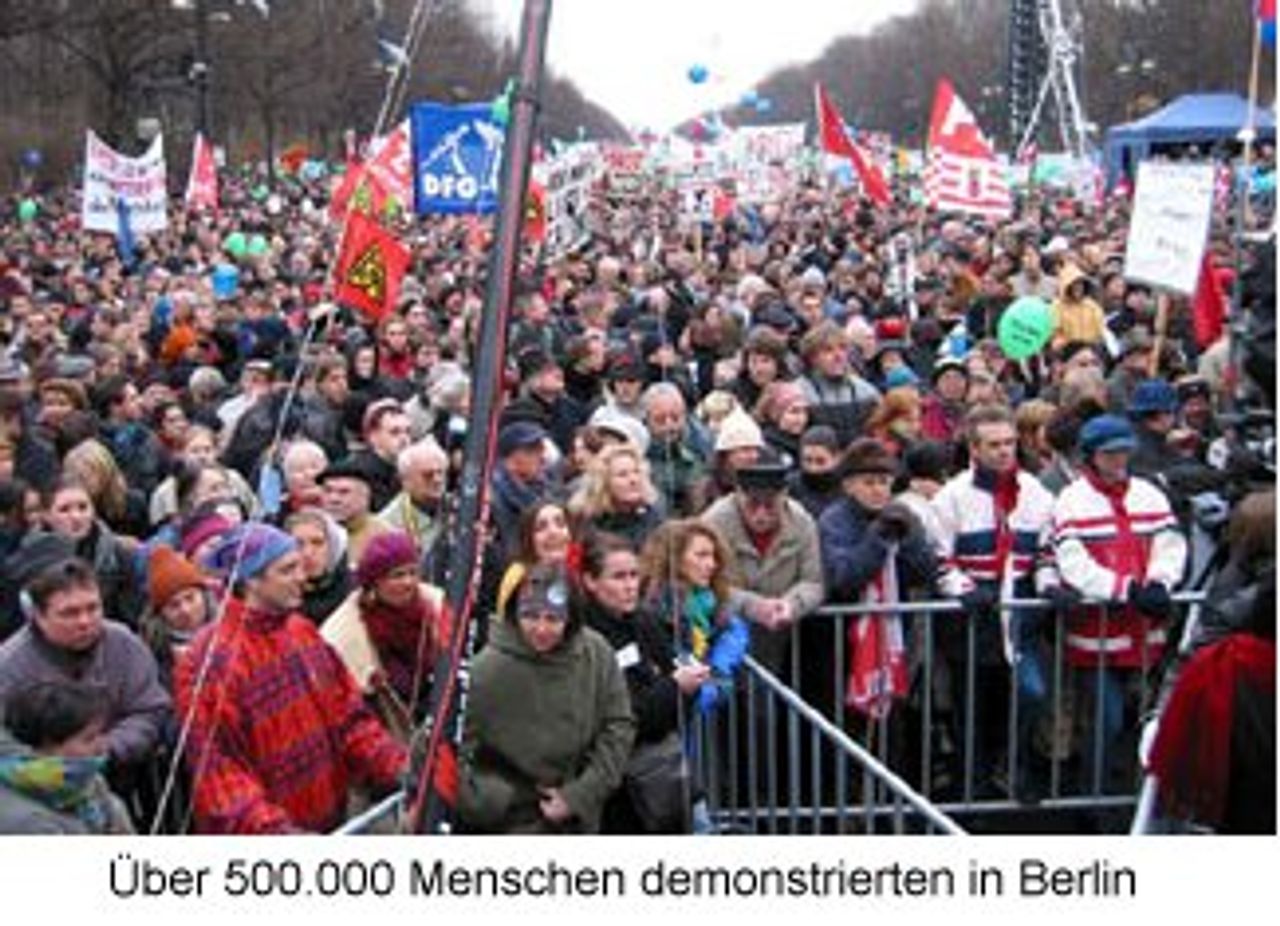 Mehr als eine halbe Million Menschen beteiligten sich in der deutschen Hauptstadt an der zentralen Protestdemonstration gegen einen Irak-Krieg. Die Demonstrationszüge, die sich im Ost- und Westteil der Stadt formierten, mussten früher als geplant losmarschieren, weil der Menschenandrang weit größer als erwartet war. Am frühen Nachmittag war die gesamte Innenstadt - diesseits und jenseits des Brandenburger Tores - von Menschenmassen überflutet.
