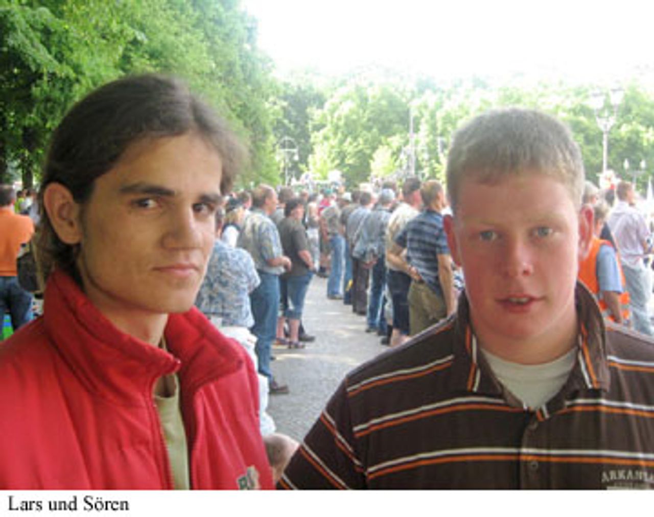 Lars und Sören sind aus Schleswig-Holstein angereist, um an der Demonstration teilzunehmen. Sören arbeitet auf einer mittelgroßen Bauernkooperative mit 147 Kühen. Er erläuterte einige der Probleme, mit denen die Bauern konfrontiert sind: