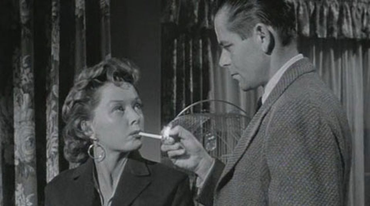 Sheridan is immediately taken in by McLane’s looks and aura of mystery, and as the stake-out continues—Sheridan and his partner, Rick McAllister (Philip Carey), observe her every move from an apartment across the street—he devises various excuses to meet her. After she discovers he is a cop who has always craved money to make up for a poor childhood, she manipulates him into getting rid of her boyfriend and taking the $200,000 he stole.