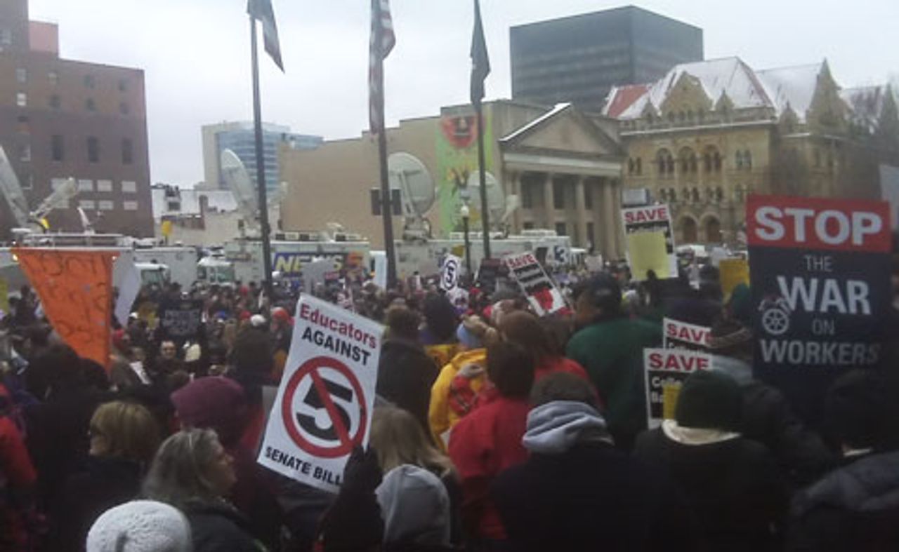 About 5,000 workers demonstrated at the Ohio Statehouse in Columbus on Tuesday against a bill backed by Republican Governor John Kasich that would drastically restrict workers’ legal ability to resist what are anticipated to be years of wage and benefit cutting. Senate Bill 5 (SB-5) would also directly cut into workers’ pay.