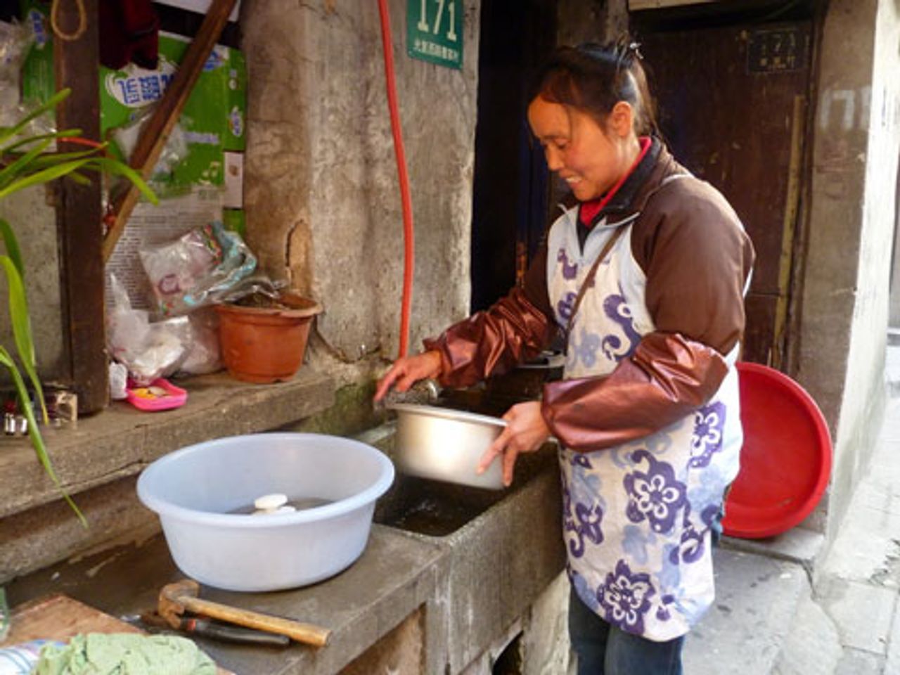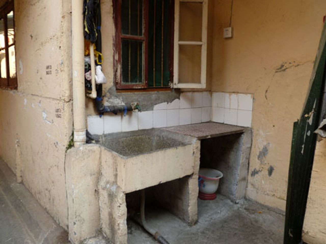 Just a stone’s throw from Shanghai’s central railway station, on Xhongxin Road, there is crowded slum housing, accessible only on foot, with shacks and shelters added on to existing buildings, often with outside stone sinks and no bathroom. Residents must use potties, whose contents are thrown into the gutters, or use the public neighbourhood toilets, a common sight in China’s cities.