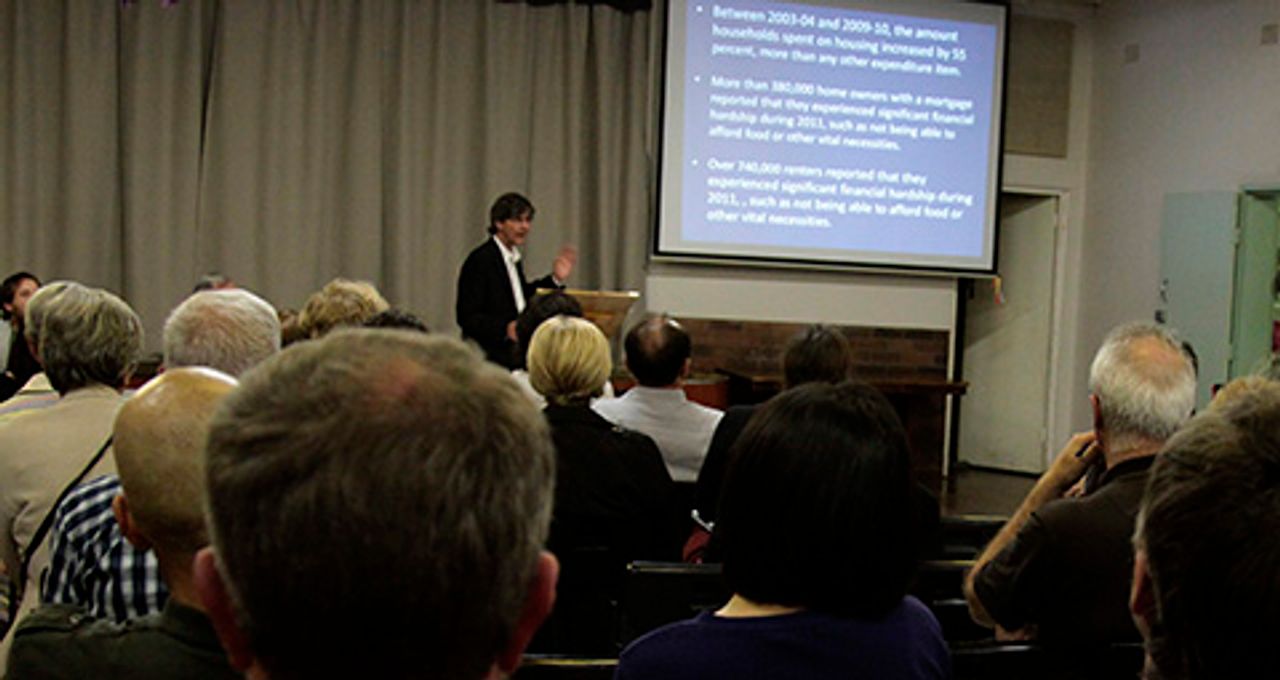Cogan illustrated the growing accommodation crisis facing many workers and young people with a series of slides showing the rising cost of housing relative to income. The statistics graphically showed the huge financial pressures on the working class, especially new home buyers or renters. These included:
