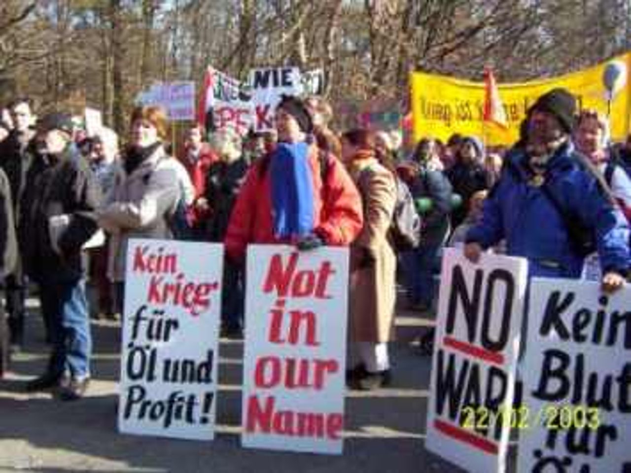 Hauptsprecher der Kundgebung war der achtzigjährige Gießener Psychoanalytiker Horst-Eberhard Richter von den Ärzten gegen Atomkrieg. Er warnte vor einem Rückfall der Welt in den imperialistischen Kolonialismus des 19. Jahrhunderts. Der wahre Wille der internationalen Völkergemeinschaft zeige sich an den Millionen von Menschen rund um den Globus, die am 15. Februar gegen den Krieg auf die Straße gegangen waren.