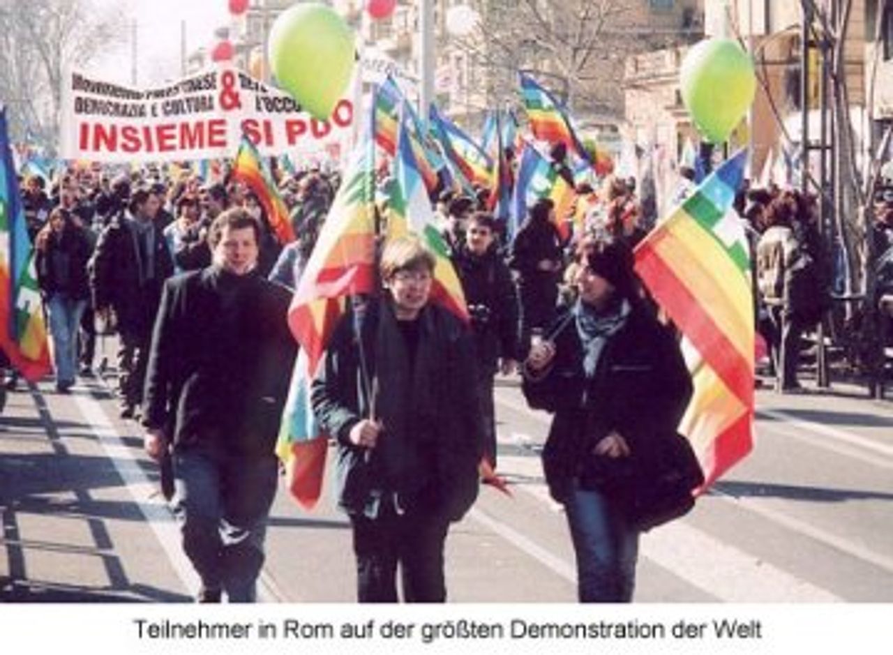 Da waren die herkömmlichen Gewerkschaften, besonders die CGIL, früher der kommunistischen Partei nahestehend, sowie die Basisgewerkschaften COBAS, politische Parteien wie Rifondazione Comunista und, schwächer vertreten, die Linken Demokraten (DS). Man sah Margherita und den Olivenbaum, auch Globalisierungsgegner wie das Europäische Sozialforum (das zu dieser Demonstration aufgerufen hatte) und Attac, außerdem zahllose Tendenzen und Parteien, Umweltbewegungen und kulturelle Organisationen, auch marschierten ganze Kommunalverwaltungen und Pfarrgemeinden der katholischen Kirche mit.
