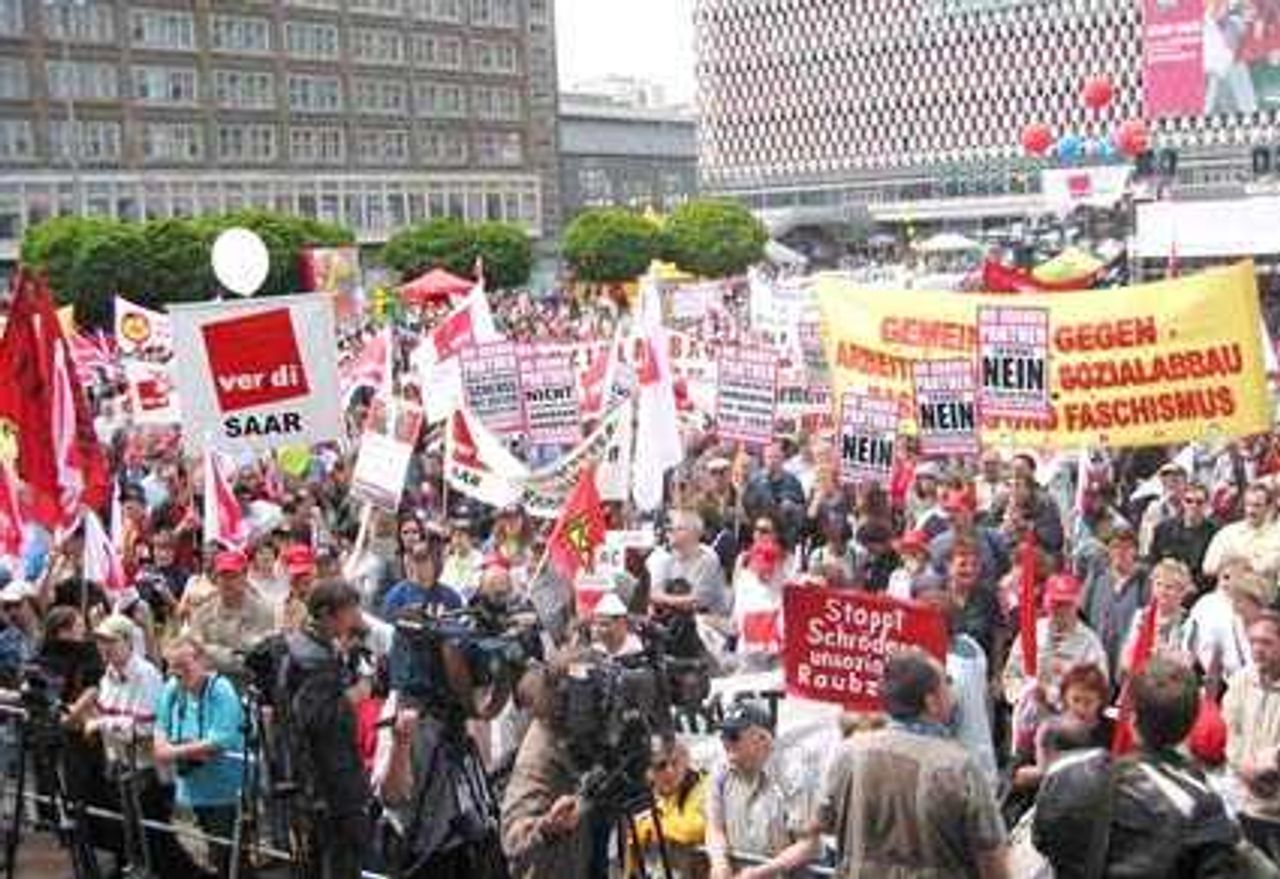 "Die Agenda 2010 ist eine Kriegserklärung der SPD-Regierung an die sozial Benachteiligten" - diese Bemerkung eines Teilnehmers der Gewerkschaftsdemonstration vom 17. Mai in Berlin kennzeichnete die vorherrschende Stimmung. Rund 10.000 Gewerkschaftsmitglieder und Mitglieder von Arbeitsloseninitiativen waren dem Aufruf der Dienstleistungsgewerkschaft Ver.di gefolgt, gegen die sozialen Angriffe der Bundesregierung zu protestieren.