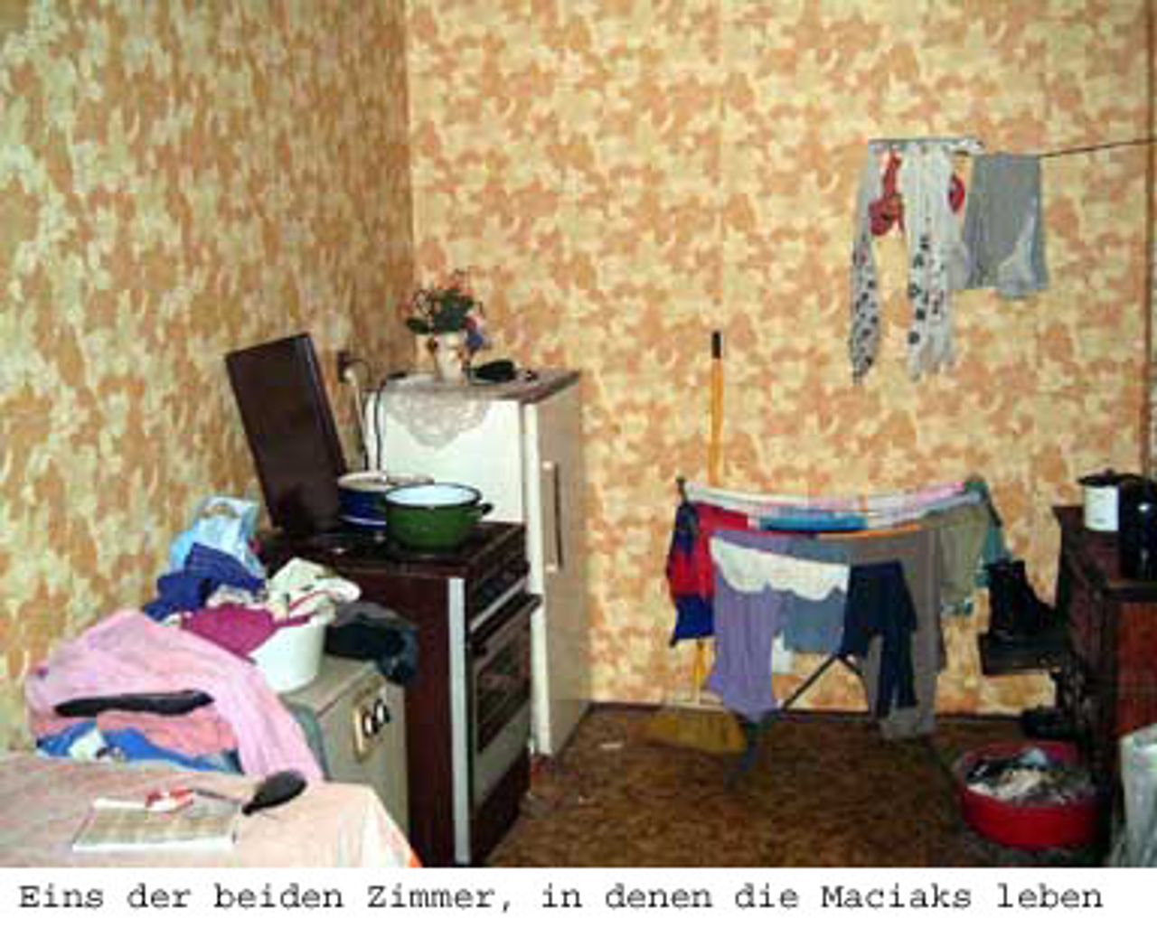 Die Wohnung der Familie besteht aus zwei Zimmern und einer Küche. Ein WC befindet sich auf dem Hof. Da kein Gasanschluss vorhanden ist, steht den Maciaks nur kaltes Wasser zur Verfügung. Trotz dieser unmenschlichen Wohnbedingungen verschlingt die Miete von 210 Zloty (ca. 52 Euro) fast die gesamte Sozialhilfe. Gerade einmal 15 Zloty (knapp 4 Euro) bleiben der Familie für alle weiteren Ausgaben im Monat. "Außerdem gibt es noch Zuschüsse. Z.B. habe ich für Schuhe 40 Zloty (ca. 10 Euro) bekommen. Da wusste ich nicht, welchem der Kinder ich jetzt neue Schuhe kaufen sollte. Lächerliche Summen. Da bleibt einem nichts übrig, als sich hinzusetzen und zu weinen."