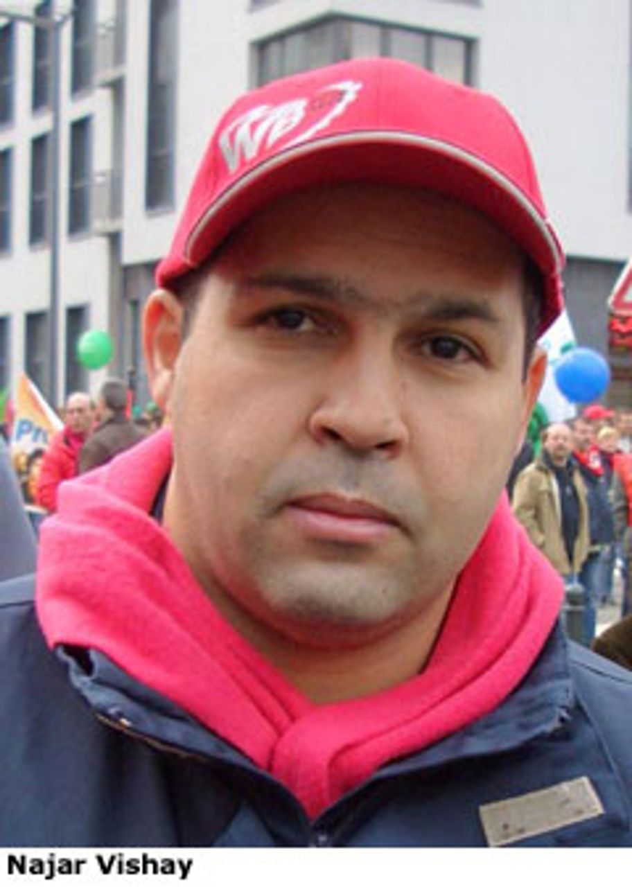 Najar arbeitet seit 20 Jahren bei Philips-Belgien und ist mit einer ganzen Betriebsdelegation angereist : "Ich arbeite in der gleichen Sparte wie die VW Arbeiter. Wir sind aus Solidarität mit den VW-Arbeitern hergekommen, die ihre Arbeit verlieren werden. Ich kenne viele Leute, die bei VW arbeiten. Außerdem befürworten wir ein soziales Europa, in dem das Individuum im Mittelpunkt des Interesses steht. Es reicht jetzt wirklich mit den Standortverlagerungen, die Leute bleiben auf der Strecke, und ganze Familien fliegen auf die Strasse. Das geschieht alles nur für den Profit. Wir sind mit der Regierung unzufrieden, die das alles geschehen lässt. Sie bietet gegen Konzerne und Unternehmer etc. keinen Schutz."