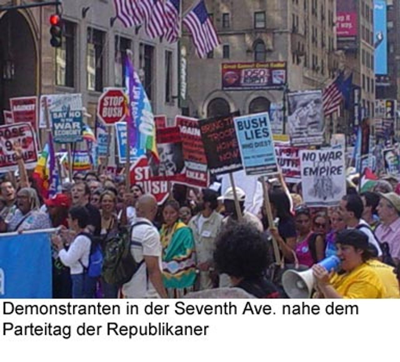 In New York demonstrierten am Sonntag Hunderttausende in eindrucksvoller Weise gegen die Politik der Bush-Regierung. Sie zogen am Madison Square Garden vorbei, wo diese Woche der Republikanische Wahlparteitag stattfindet.