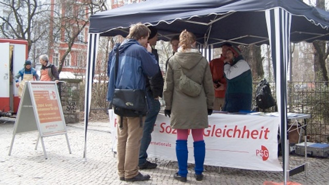 PSG-Stand in Berlin-FriedrichshainIm Zuge der Wahlkampagne organisierte die PSG vergangenen Samstag einen Stand im Berliner Stadtteil Friedrichshain. Plakate auf denen zu lesen war, "Gemeinsam gegen das Europa der Konzerne" und Bücher von Leo Trotzki über die "Verratene Revolution" oder andere Klassiker des Marxismus stießen auf großes Interesse bei den Passanten. Immer wieder wurde in Diskussionen die große Empörung über die soziale Ungleichheit in der Gesellschaft sichtbar. Auch die offene Klassenpolitik der Regierung im Interesse der Banken und Superreichen stieß auf vehemente Kritik.
