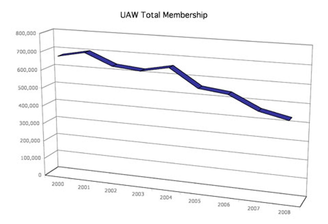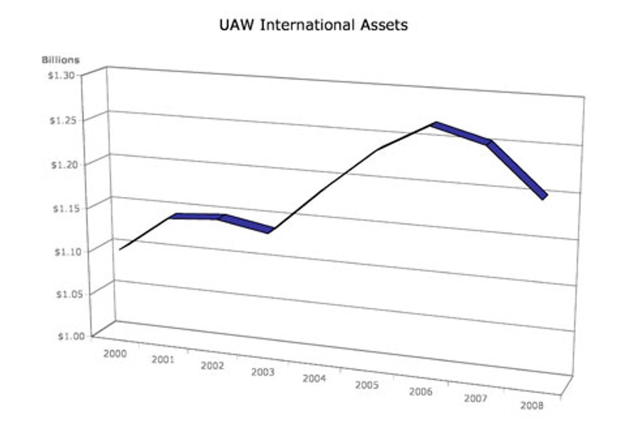 Der massive Mitgliederschwund bei der UAW hat sich kaum auf das finanzielle Wohlergehen des Verwaltungsapparates ausgewirkt. 2001 hatte die Gewerkschaft 701.000 Mitglieder. Ihr Vermögen wurde auf 1.1 Mrd. Dollar geschätzt. 2008 waren es nur noch 431.000 Mitglieder - ein Rückgang um ca. 40 Prozent.