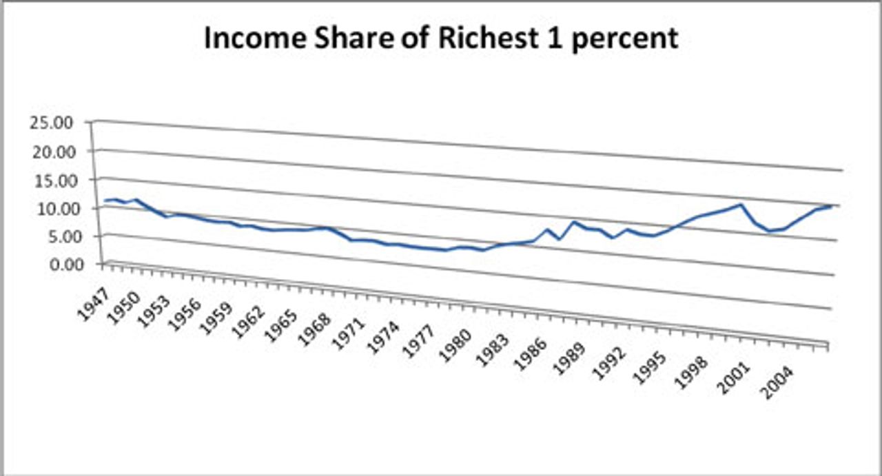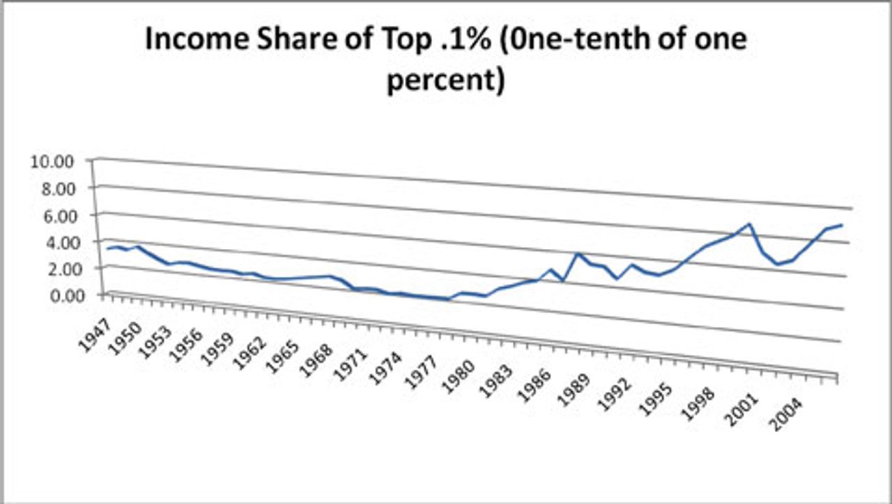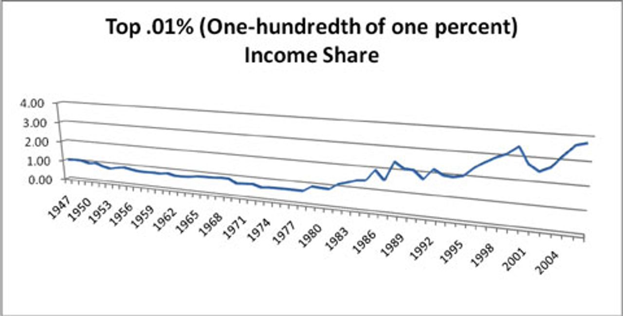 Dieser Prozess begann sich ab 1979 umzukehren - hin zu einer immer ausgeprägteren Konzentration von Reichtum beim reichsten Hundertstelprozent (und auch bei den reichsten 5 Prozent). In dem Jahr strich das reichste Hundertstelprozent 0,9 Prozent des Volkseinkommens ein. 1989 waren es bereits 2,3 Prozent geworden, und 1999 betrug sein Anteil 2,92 Prozent. 2006 war der Anteil der reichsten Amerikaner am Volkseinkommen auf 3,76 Prozent gestiegen (die Zahlen von 2006 sind die aktuellsten, über die wir anhand der Untersuchungen der beiden Professoren Piketty und Saez verfügen).