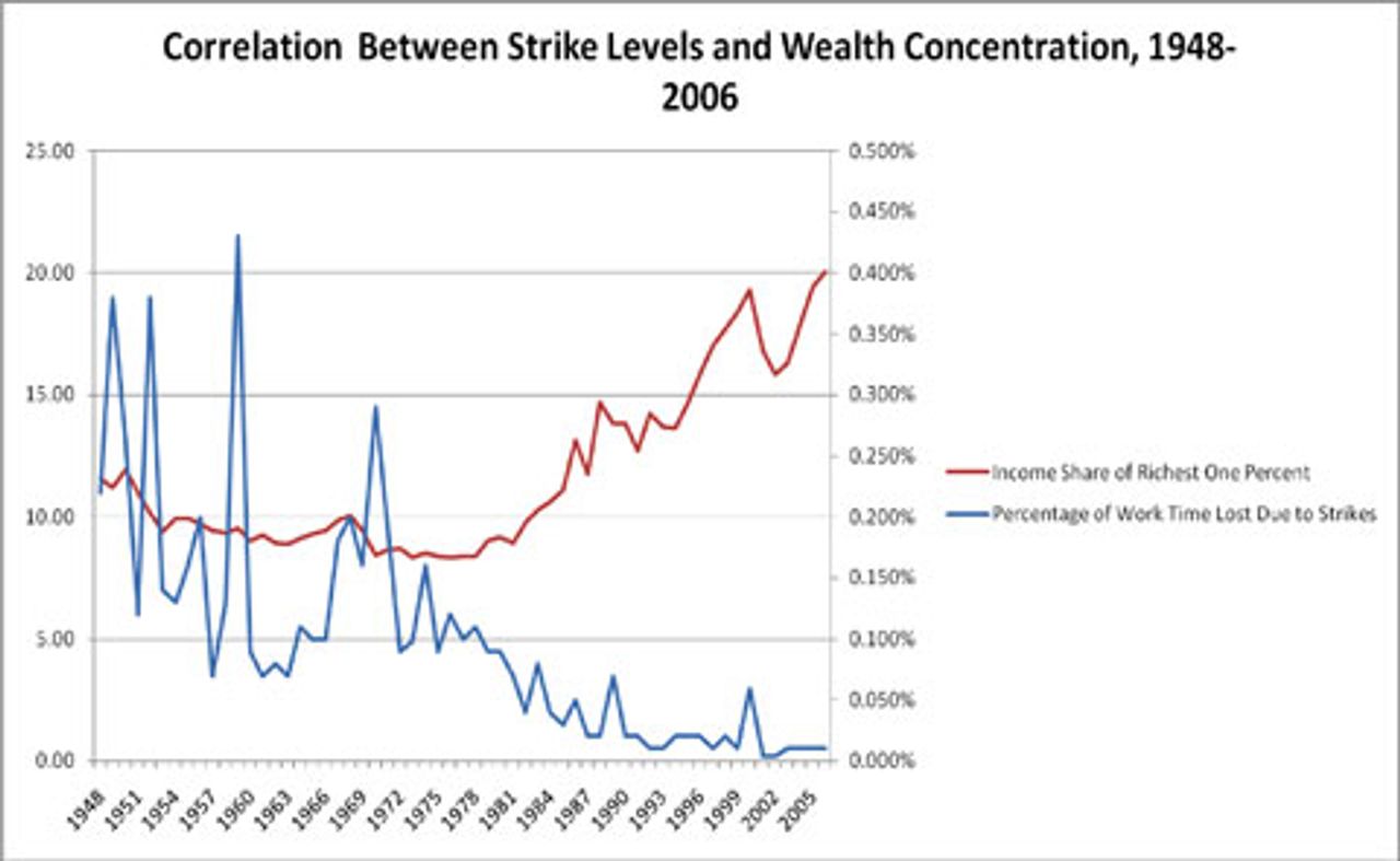 Legt man die Graphik des Einkommensanteils der reichsten Schicht der kapitalistischen Klasse zwischen 1947 und 2006 über die Graphik des Streikniveaus der gleichen Zeitspanne, so zeigt sich der Zusammenhang zwischen den beiden Variablen sehr deutlich. Ein hohes Niveau an Militanz und offenen Klassenkonflikten geht einher mit einer geringeren Akkumulation von Reichtum bei den Reichen und einem Rückgang sozialer Ungleichheit. Werden soziale Konflikte aber unterdrückt, erhöht sich die Akkumulation von Reichtum wie auch das Niveau der sozialen Ungleichheit schnell. Die Graphik dieser zusammenhängenden Sachverhalte zeigt, dass die Lücke zwischen der Kurve der Akkumulation von Reichtum des reichsten ein Prozents und der Kurve der Streikaktivität in den letzten zwanzig Jahren weit auseinanderklaffen.
