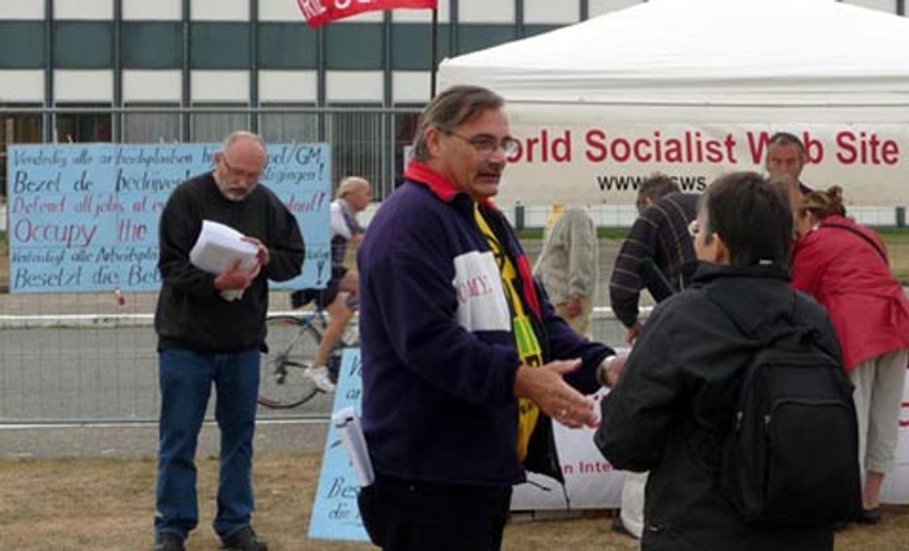 Informationsstand der WSWSVertreter des WSWS und der Partei für Soziale Gleichheit (PSG) verteilten rund 2.000 Flugblätter in niederländischer, deutscher, englischer und französischer Sprache. Es handelte sich um einen Offenen Brief des PSG-Vorsitzenden Ulrich Rippert, der direkt an die Opel- und GM-Arbeiter gerichtet ist. Darin warnt er: "Der Verkauf von GM Europe an Magna bezweckt nicht die "Rettung" von Opel. Er dient dazu, die Last der Weltwirtschaftkrise auf eure Schultern abzuwälzen. Er ist Bestandteil eines weltweiten Generalangriffs auf die arbeitende Bevölkerung, deren Lebensstandard wieder auf das Niveau der dreißiger Jahre gesenkt werden soll. [...]