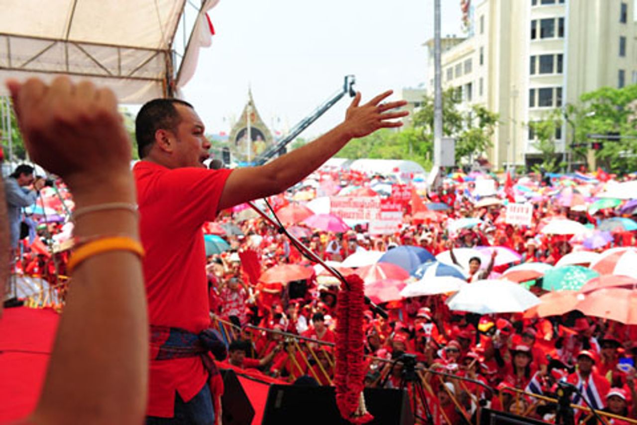 Ein UDD-Führer spricht zu den VersammeltenDas erbitterte Gerangel zwischen den verschiedenen Gruppierungen der herrschenden Elite Thailands hat sich nach der Amtseinführung von Abhisit noch weiter verschärft. Die Entscheidung des Obersten Gerichtshofs vom 26. Februar wurde live im nationalen Fernsehen und Radio übertragen, aber zeitlich so gelegt, dass mögliche Störungen der thailändischen Börse gering gehalten wurden. Die Regierung mobilisierte 20.000 Soldaten und Polizisten im ganzen Land, allein etwa 6000 in Bangkok, weil sie Proteste erwartete.