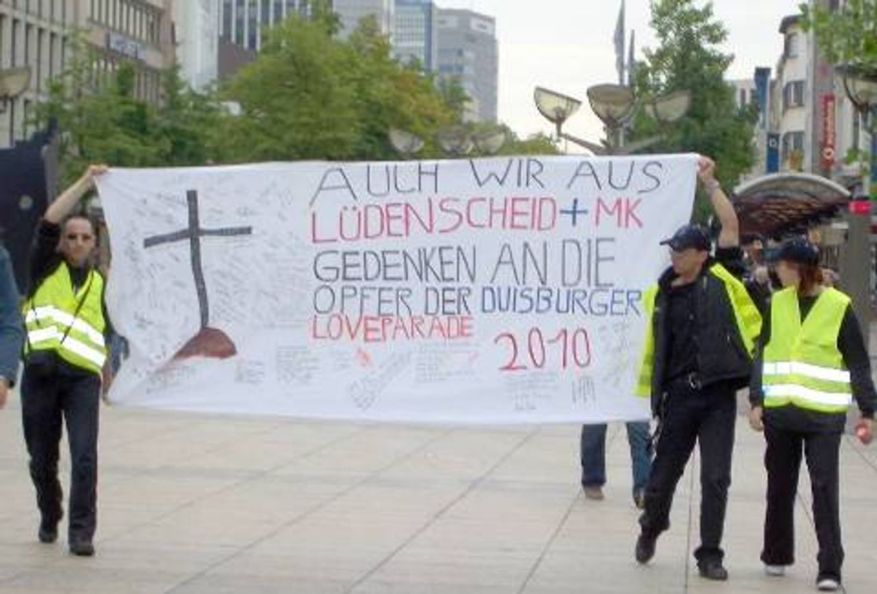 Mike Danielzik, links am TransparentMike Danielzik aus Lüdenscheid hatte selbst an der Loveparade teilgenommen. Er war noch rechtzeitig auf das Veranstaltungsgelände gelangt und so der Katastrophe entkommen. Er zeigte sich empört darüber, dass die Verantwortlichen wochenlang alle Warnungen ignoriert hatten.