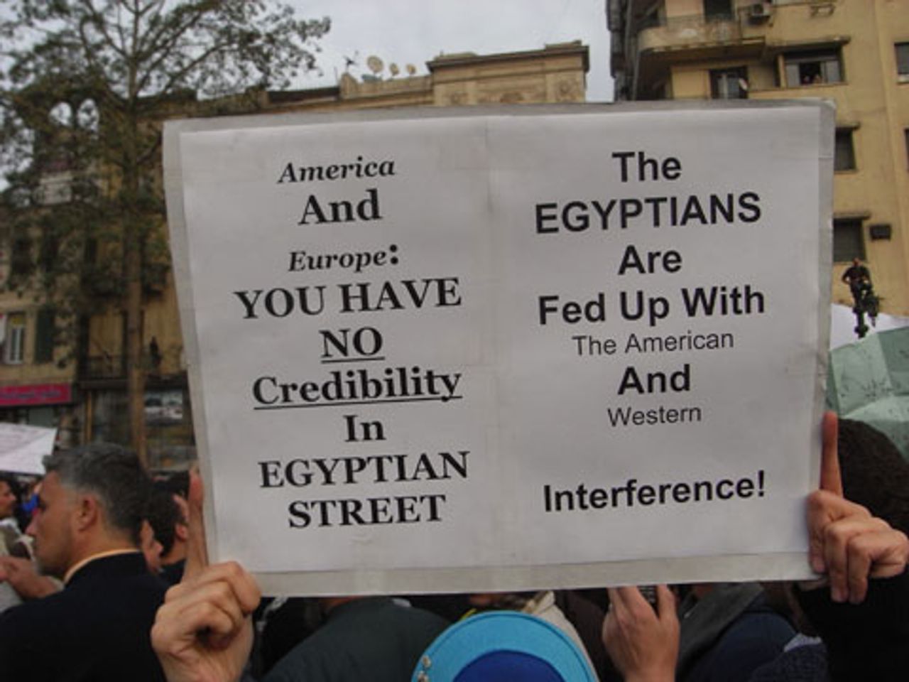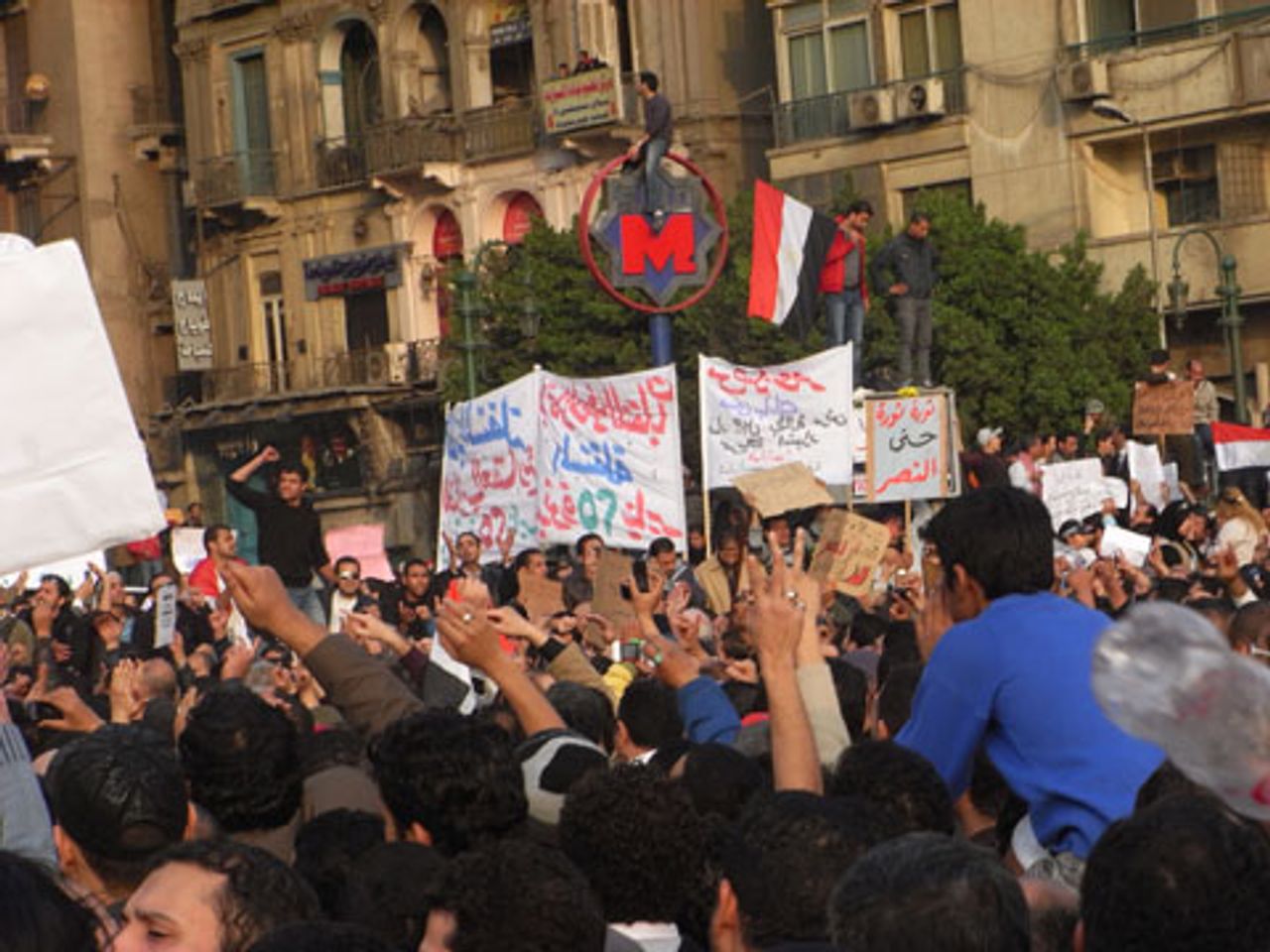 Überall sind Menschen: auf den Straßenlaternen, auf den Balkonen und Dächern der umliegenden Häuser und auch auf den benachbarten Plätzen in der Innenstadt. Trotz der ausgelassenen Partystimmung scheint vielen der Ernst der Lage bewusst. Es geht nicht nur darum einen Diktator zu stürzen, sondern die gesamten politischen und sozialen Verhältnisse in der Region in Frage zu stellen. Viele Plakate rechnen mit der Politik der USA ab, die seit 30 Jahren den Mubarak-Clan unterstützen und ihn auch nach Tagen des Protest und hunderten von Toten nicht fallen lassen wollen. Auf einem Plakat ist zu lesen: „Amerika und Europa – ihr habt keine Glaubwürdigkeit in den Straßen Ägyptens.“ Andere skandieren: „Zuerst Tunesien, jetzt Ägypten.“