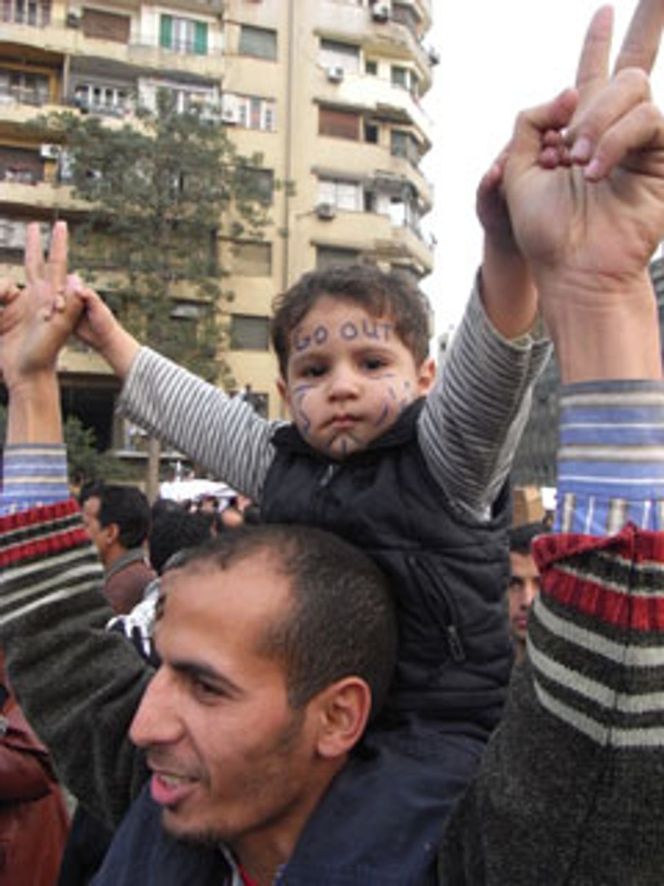 Was nun hier auf dem Meidan um mich herum stattfindet, ist wirklich schwer in Worte zu fassen. Bereits Hunderttausende sind auf dem Platz versammelt und ständig strömen von allen Seiten mehr Menschen heran. Alle Bevölkerungsschichten sind zu sehen. Gesichter die von jahrelanger Arbeit gezeichnet sind, aber nun freudig lachen, Studenten voller Begeisterung, Hausfrauen, die bisher als politisch desinteressiert bezeichnet wurden und nun selbstgemalte Plakate zeigen, Akademiker, darunter viele Juristen, Künstler und viele Familien. Väter mit ihren Söhnen und Töchtern auf den Schultern, Alte und Junge, ganz Kairo scheint auf den Beinen.