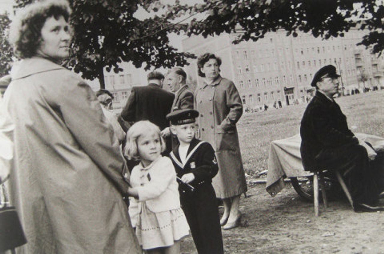 Auf den Fotografien sind die Gesichter und Personen oft abgeschnitten, dem Betrachter abgewandt und in einer verzerrenden Unteransicht aufgenommen. In den Bildern der DDR hingegen wird ein Ort präsentiert, in der zwar die Kriegszerstörungen noch sichtbarer sind, aber Gemeinschaften der Menschen im Zentrum stehen: Kindergartengruppe, geselliges Zusammensein auf der Wiese. Doch es fehlen Ausgelassenheit und Fröhlichkeit. Auf allen Bildern herrscht eine angespannte Atmosphäre. Die Menschen blicken nie in die Kamera, selten einander an, stattdessen immer seltsam weit weg aus dem Bild hinaus. Sie wirken abwartend, wie auf dem Foto Besuch von N.S. Chruschtschow. Dieses Bild entstand 1957, Manch einer hoffte, ein Jahr nach Chruschtschows halbherziger Abrechnung mit Stalin auf ein „Tauwetter“ in der DDR. Doch man wusste auch, dass es Chruschtschow war, der den Ungarn-Aufstand blutig niedergeschlagen hatte.