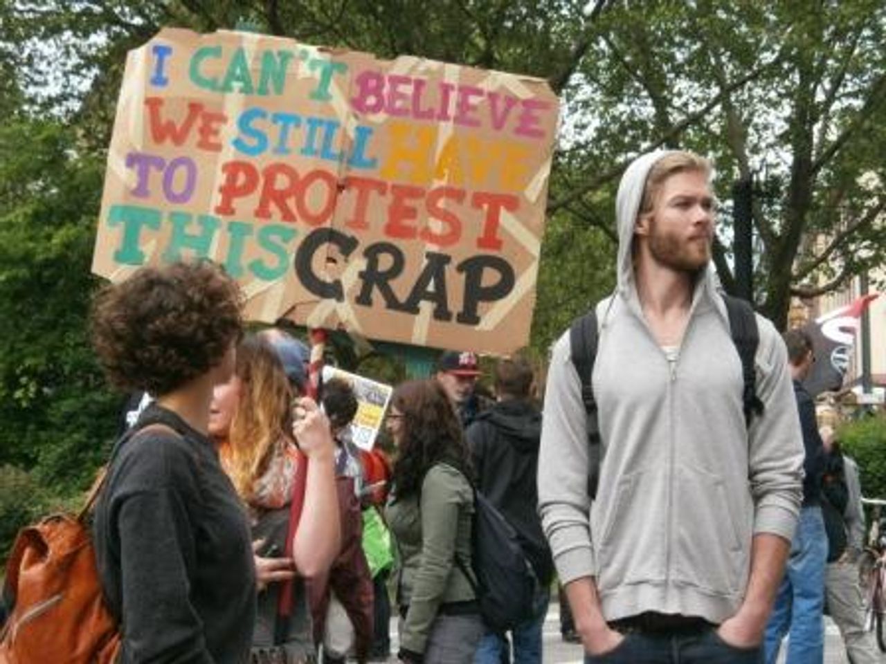 Nachts um halb elf zog die Polizei endlich ab. Sie hatte 45 Personen festgenommen, und das Blockupy-Bündnis zählte 200 Verletzte. Wütend zogen über dreitausend Menschen in einem gemeinsamen Protestzug zum Hauptbahnhof.