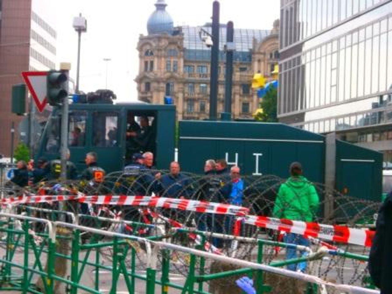 Zu diesem Zeitpunkt befand sich ein riesiges Aufgebot von martialisch ausgerüsteten Polizeibeamten, panzerähnlichen Fahrzeugen und Wasserwerfern in der Bankenmetropole Frankfurt. Die Einsatzhundertschaften waren nicht nur aus ganz Hessen, sondern auch aus Sachsen, Baden-Württemberg und Nordrhein-Westfalen zusammengezogen worden. Hubschrauber kreisten über der Stadt, um die Szenerie zu beobachten. Polizisten filmten die Teilnehmer.