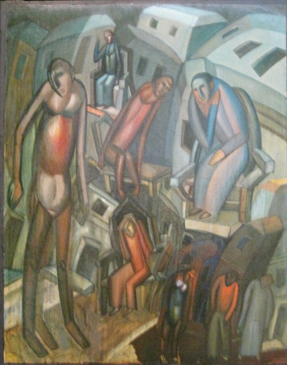 Von Pawel Filonow, einem Vertreter des russischen Futurismus, der sich als Sohn proletarischer Eltern weitgehend als Autodidakt und in Abendkursen ausbildete, sind fünf großformatige Bilder zu sehen, die auf eine recht eigenständige Entwicklung dieses Künstlers verweisen. Besonders beeindruckend ist das Bild von 1911-12 mit dem Titel Die, die nichts zu verlieren haben. Es zeigt lang gestreckte, gebeugte Gestalten in verschiedenen Posen, eingezwängt in kubistisch verschachtelte Gebäude. Das Bild ist in grauen, bläulichen und rötlichbraunen Tönen gehalten.