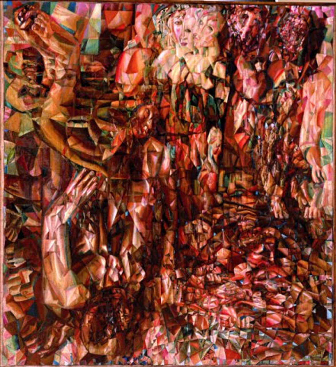 Ein anderes Bild mit dem Titel Deutscher Krieg, gemalt 1914-15, zeigt deutlich, was er mit analytischer Kunst meint. Das monumentale Bild ist in Braun und Beigetönen mit wenigen grünlichen Einsprengseln gehalten. Figürliches ist kaum noch zu ahnen; alles ist wie durch kleinteilig geschliffene Prismen zersplittert, die eine Dynamik des Grauens entstehen lassen.