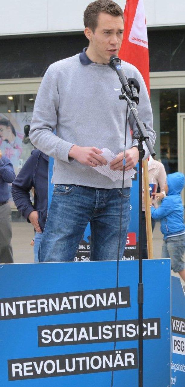 Christoph Vandreier, ebenfalls PSG-Kandidat bei den Europawahlen, konzentrierte sich in seiner Ansprache auf die Politik des sozialen Niedergangs in der EU, die von der Merkel-Regierung vorangetrieben wird. "Der Krieg nach außen geht mit einem Krieg nach Innen einher. Um die Aufrüstung zu finanzieren und die Profite der Banken und Konzerne zu mehren, werden alle sozialen Rechte der Arbeiter angegriffen", sagte Vandreier. Griechenland diene dabei "den herrschenden Eliten als Exempel". Seit 2010 seien die Löhne in Griechenland um durchschnittlich 50 Prozent gesunken, fast ein Drittel der Erwachsenen und zwei Drittel der Jugendlichen seien arbeitslos. 40 Prozent der griechischen Arbeiter seien von der Krankenversorgung abgeschnitten. "Auf den Straßen Athens sieht man hungernde Kinder und Menschen, die an behandelbaren Krankheiten sterben, weil sie ihre Medikamente nicht mehr bezahlen können", erklärte Vandreier. Dies sei das Programm, das die Bundesregierung in ganz Europa und auch in Deutschland durchsetzen wolle.