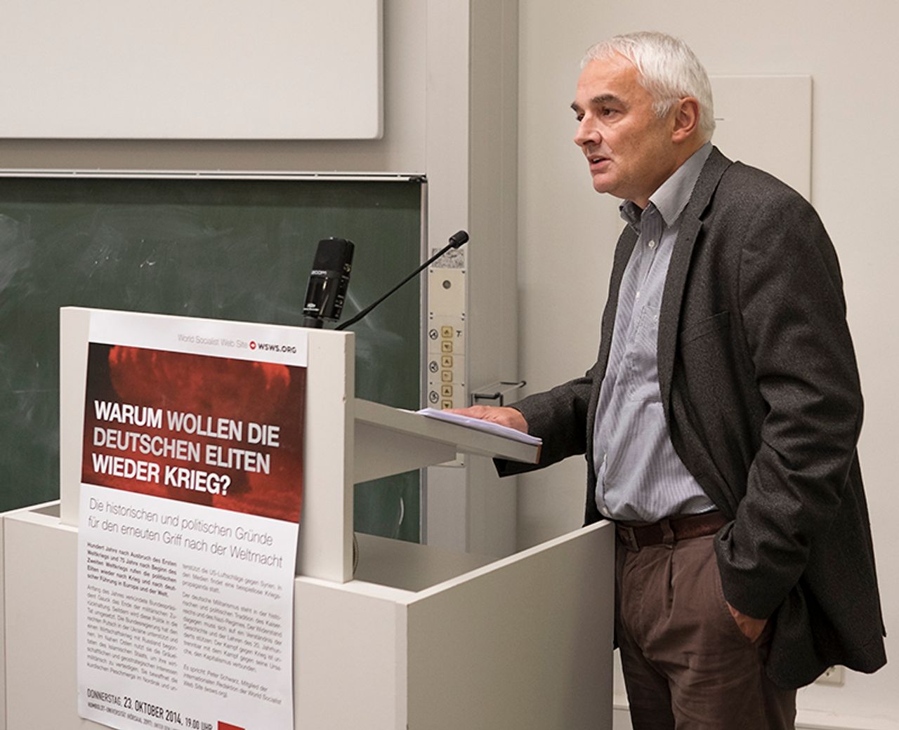 Der ausführliche Vortrag von Peter Schwarz, dem Vorstandsmitglied der PSG und Sekretär des Internationalen Komitees der Vierten Internationale (IKVI) wurde mit großer Konzentration und Aufmerksamkeit verfolgt. Der Sprecher der IYSSE Hochschulgruppe an der HU begrüßte Peter Schwarz mit den Worten, es gäbe wohl kaum jemanden, der besser in der Lage wäre die Frage des Abends zu beantworten. Denn als Mitglied der internationalen Redaktion der World Socialist Web Site (WSWS) habe Schwarz eine wichtige Rolle gespielt, die historischen und politischen Gründe für Deutschlands erneuten Griff nach der Weltmacht zu analysieren.