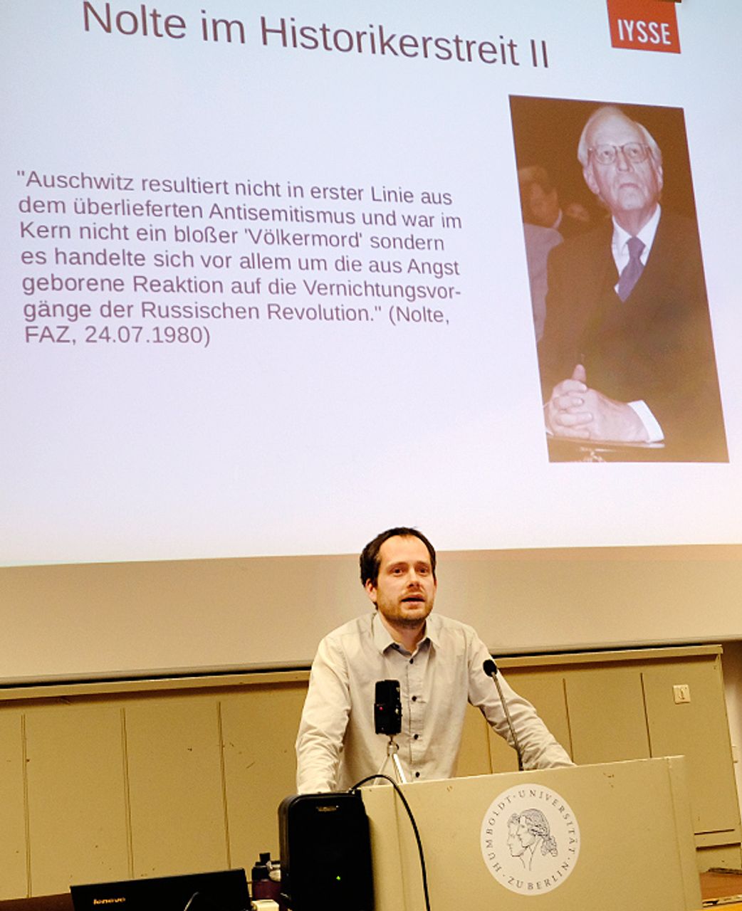 Nun werde versucht, Nolte zu rehabilitieren. Nolte selbst dürfe in wichtigen Zeitungen wieder publizieren. Etliche Journalisten und Professoren wiederholten seine Thesen und versuchten, den Holocaust von seinen Wurzeln im deutschen Imperialismus zu lösen. Eine herausragende Rolle spiele dabei Jörg Baberowski, der den Lehrstuhl für osteuropäische Geschichte an der HU innehat.