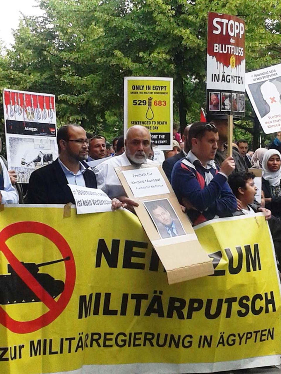 Am Sonntag versammelten sich dutzende Demonstranten, darunter viele Ägypter, vor dem Berliner Polizeipräsidium, um gegen die Verhaftung Mansours zu protestieren.