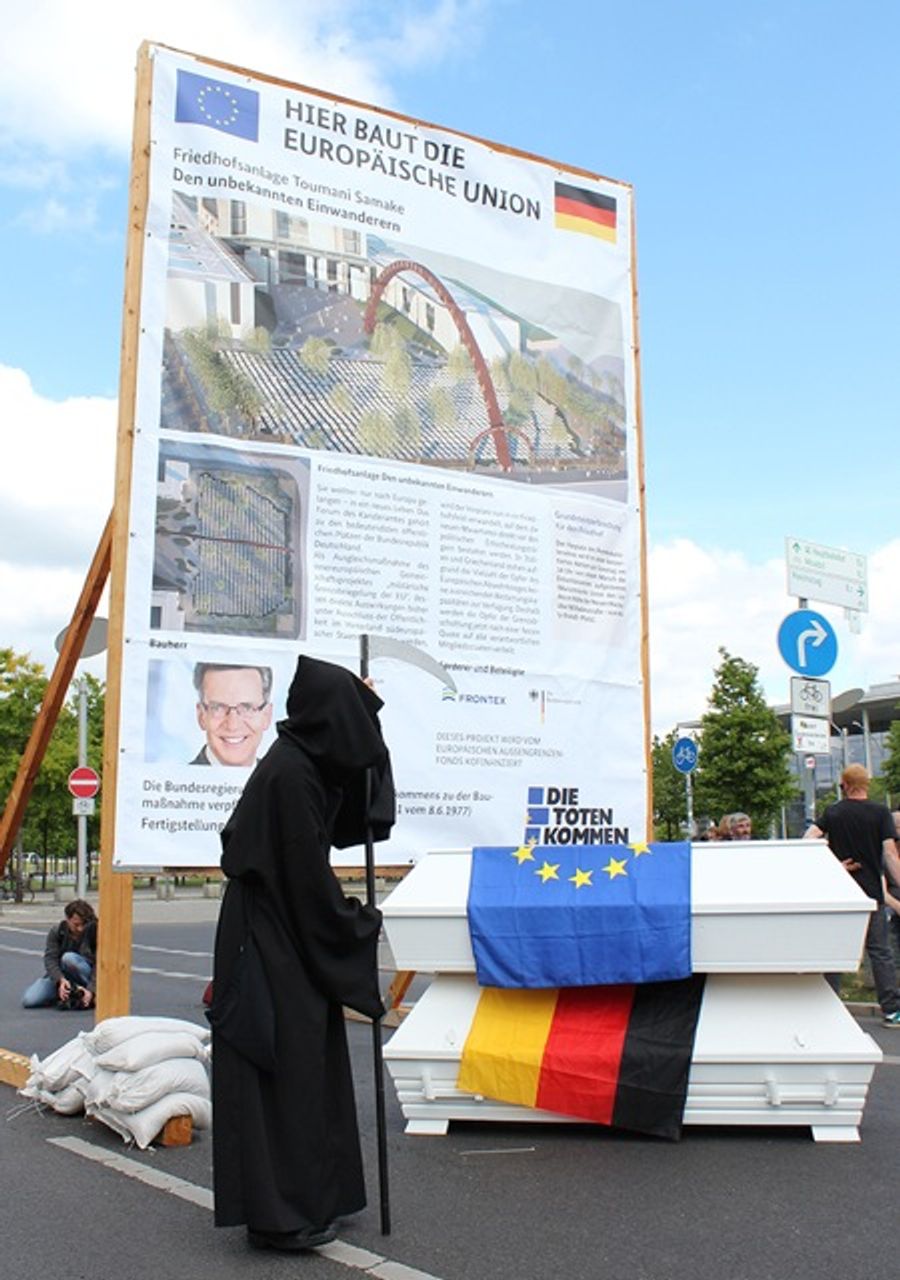 Auf dem Rasen vor dem Parlament hoben sie symbolische Gräber aus und dekorierten sie mit 100 hölzernen Kreuzen, die daran erinnern sollten, dass alleine in diesem Jahr über tausend Menschen den Versuch, Europa zu betreten, mit dem Leben bezahlt haben. Später am Sonntagabend schritt die Polizei ein und nahm 50 Demonstranten fest. Am Montagmorgen wurden die Kreuze vom Gelände des Bundestages entfernt.