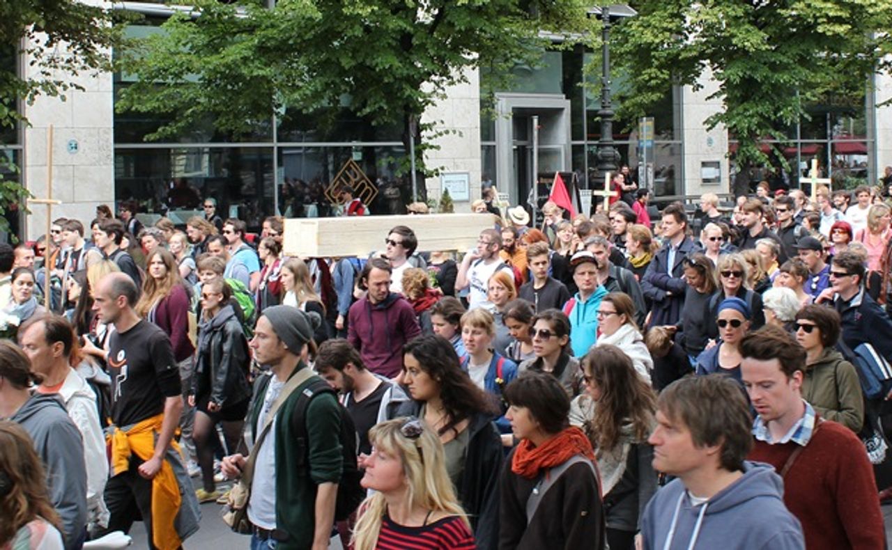 Ursprünglich sollte die Demonstration zum Bundeskanzleramt ziehen. Die Initiatoren der Aktion wollten die Bundeskanzlerin durch den Trauermarsch und die Särge mit dem Ergebnis ihrer Politik konfrontieren. Doch dann verbot die Polizei in letzter Minute den Marsch vor das Kanzleramt und errichtete Absperrungen um das Gebäude. Die Demonstranten hielten aber an ihren Plänen fest und versammelten sich vor dem wenige hundert Meter entfernten Bundestag.