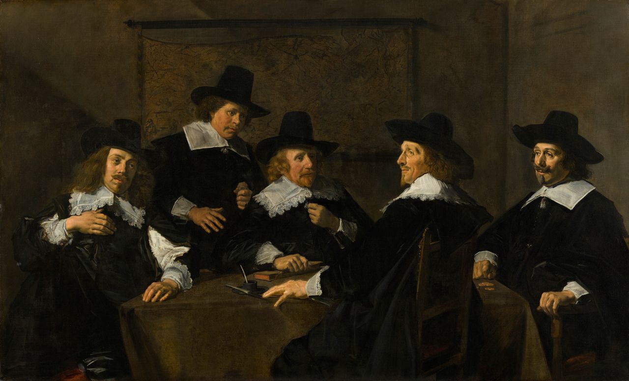In dem Bild „Regenten des St. Elisabeth-Hospiz von Haarlem“ (1641) malte Hals die Männergruppe, die für ein Armenhospiz verantwortlich war. Das war in der Zeit, bevor er in finanzielle Schwierigkeiten geriet. Das Gemälde war für das Sitzungszimmer des Krankenhauses bestimmt. Die Männer, meist Brauer oder Söhne von Brauereifamilien, sind naturgetreu dargestellt, jeder mit seiner individuellen Vorstandsfunktion: der Sekretär trägt das Protokollbuch, der Schatzmeister spielt mit ein paar Münzen. Nur der Vorsitzende zeigt sein vollständiges Profil. Die Gesichter verraten Wohlstand und sind offen, ernsthaft, vielleicht etwas selbstgefällig.