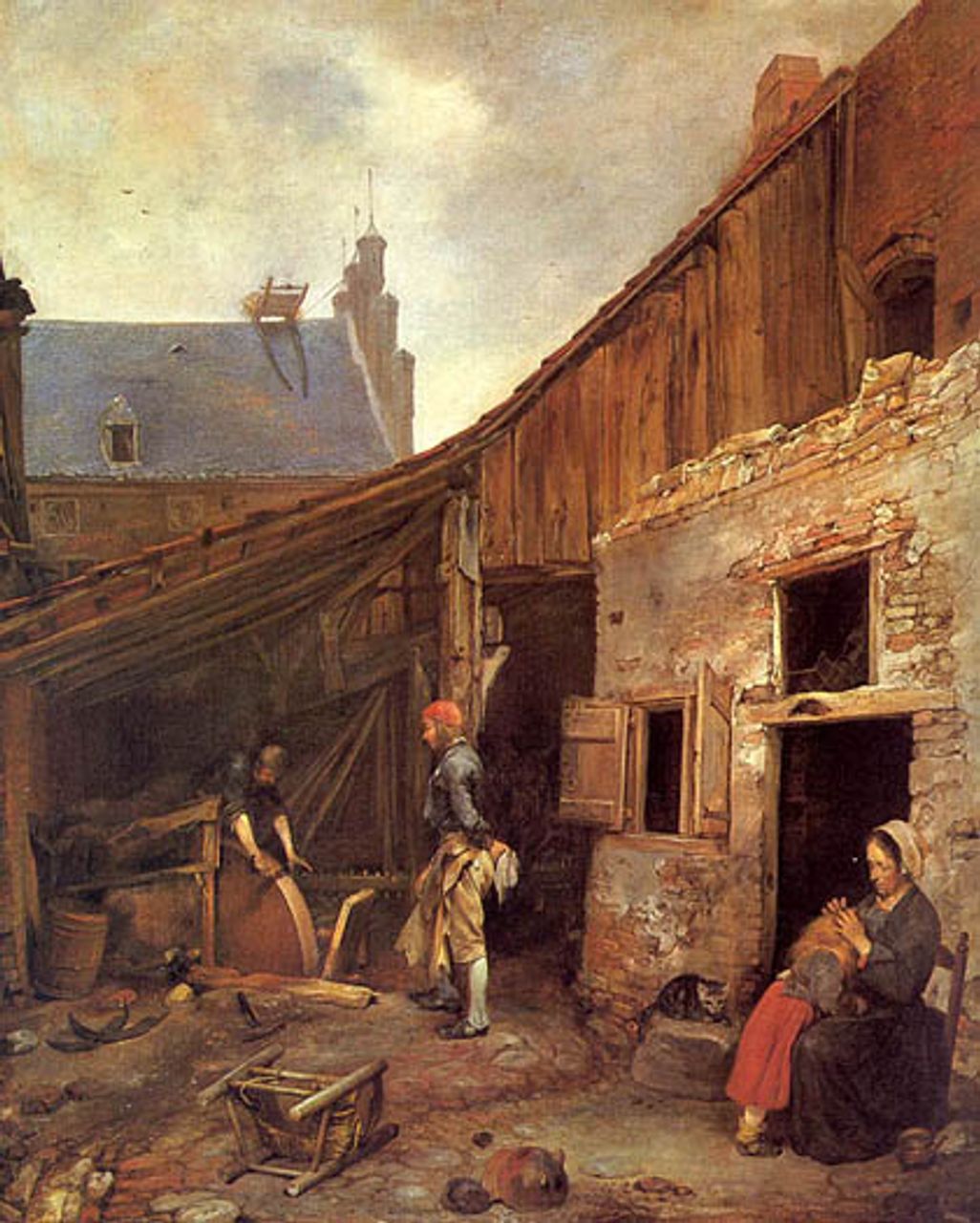 Die „Familie des Messerschleifers“ (1653) von Ter Borch ist ein weiteres, anrührendes und komplexes Werk. Der Maler platziert seinen Messerschleifer ausgestreckt auf einer Plancke liegend, ein Sensenblatt gegen den drehenden Schleifstein pressend; ein Kunde schaut ihm zu. Aber rechts von ihm, und in der Tat im Vordergrund des Betrachters, sitzt eine Frau, wahrscheinlich die Frau des Messerschleifers, und „sucht geduldig den Haarschopf ihres Kindes nach Läusen ab“, wie es im Katalog heißt: „eine übliche und weit verbreitete Mühsal“. Eine Katze schaut zu. Wie das brüchige Mauerwerk und baufällige Vordach deutlich zeigen, lebt die Familie in äußerst bescheidenen Verhältnissen. Wie kommt es, dass man sich heute dafür schämen würde, ein solches Bild zu malen?