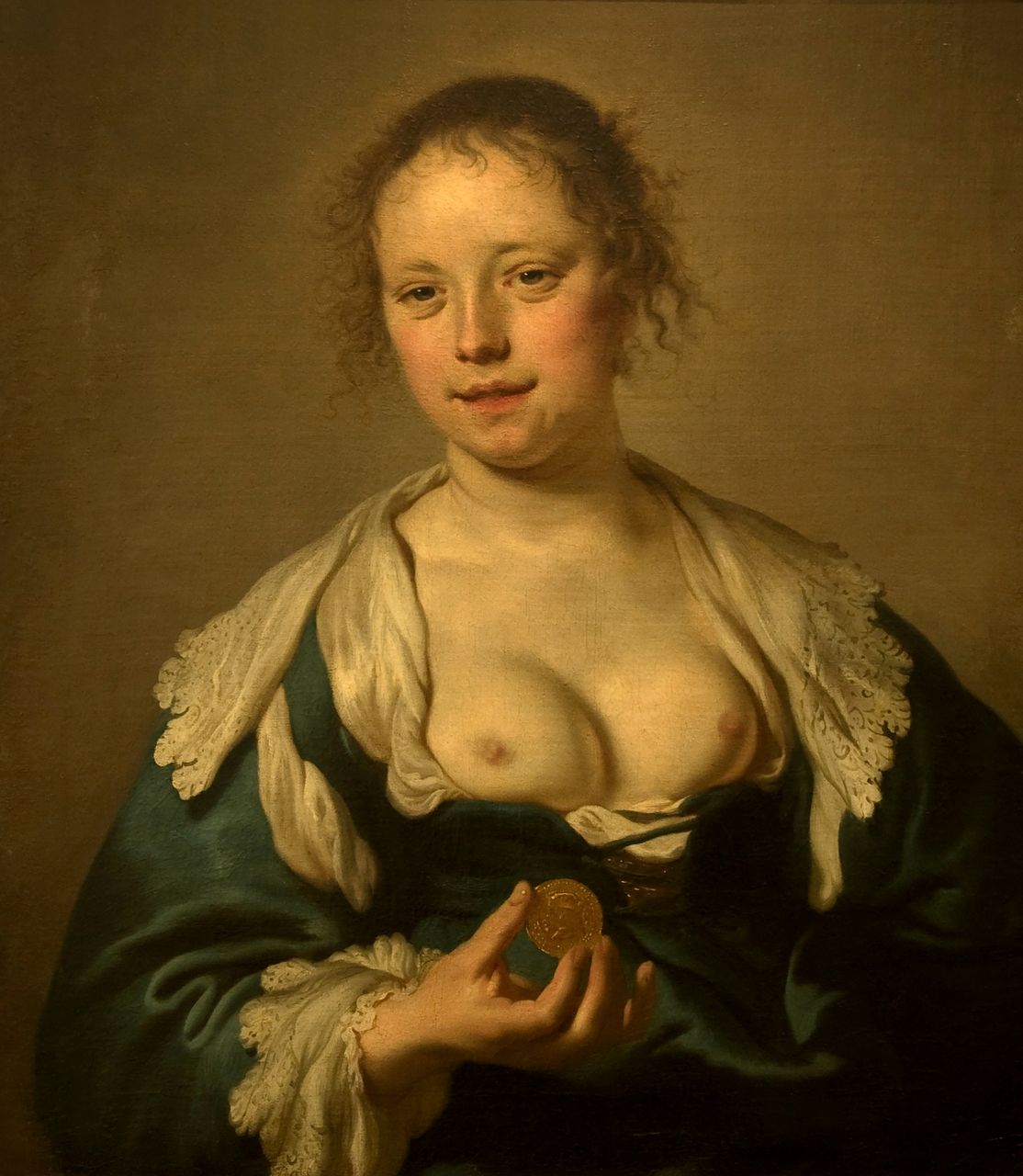 Ein besonders bemerkenswertes und bestürzendes Bild zeigt eine Prostituierte mit bloßem Busen, ein Goldstück in der Hand (Jacob Backer, Frau mit entblößter Brust und einer Münze, 1636). Mit einem leisen Lächeln schaut sie den Betrachter an.