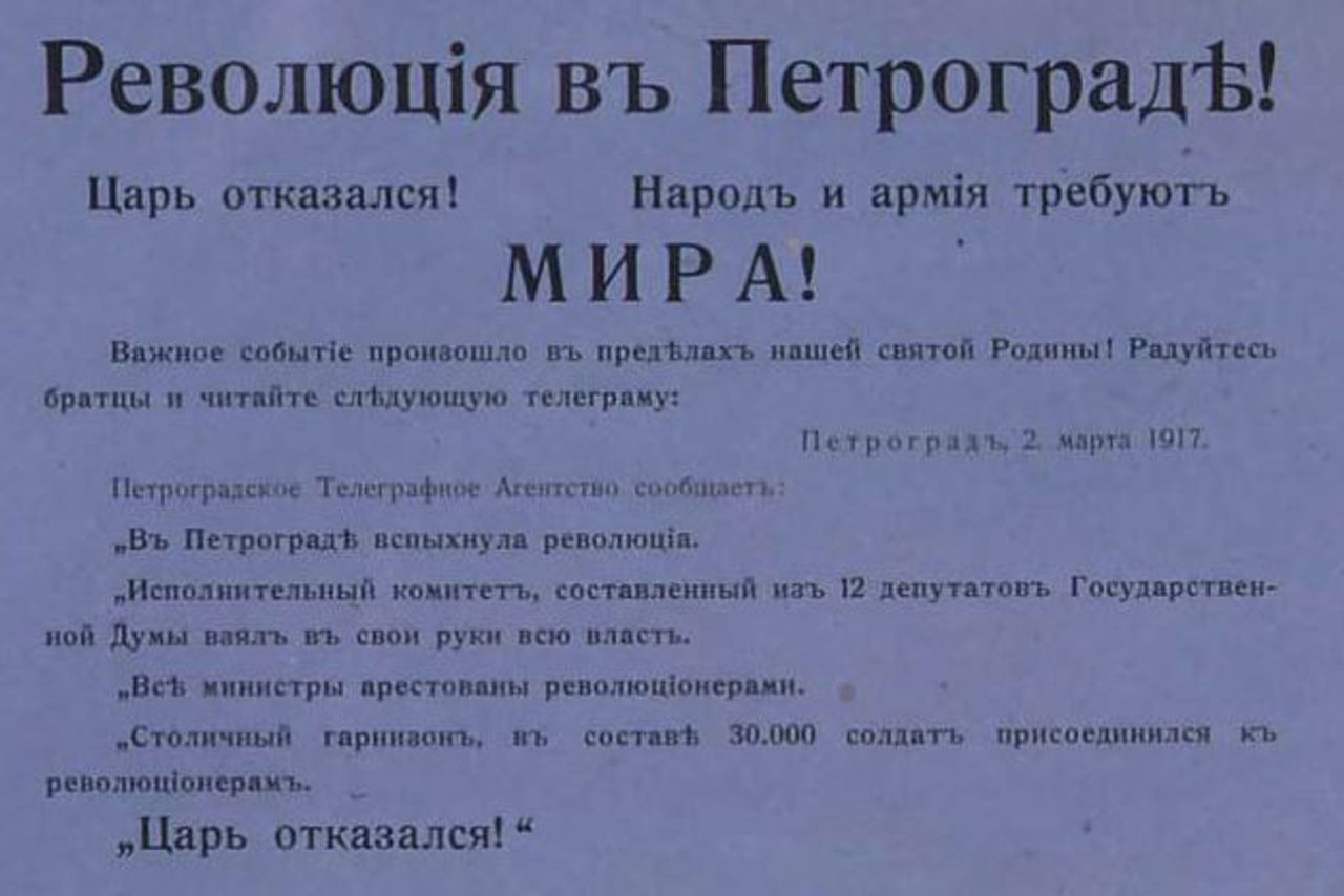 Im Telegramm, in dem die Abdankung des Zaren angekündigt wird, heißt es: „Revolution in Petrograd! Der Zar hat abgedankt! Das Volk und die Armee fordern Frieden!“ Weiter wird dort von der Bildung einer Provisorischen Regierung, der Verhaftung von Ministern durch die Revolutionäre berichtet und dass „30.000 Soldaten der Hauptstadtgarnison auf die Seite der Revolution“ übergewechselt seien.