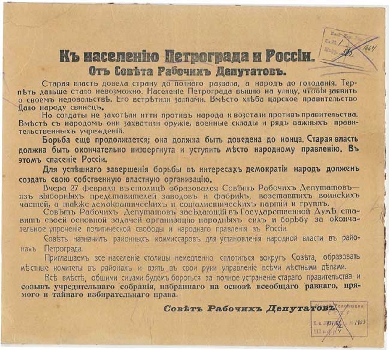 Die wirkliche Macht in Petrograd liegt jetzt beim Petrograder Sowjet der Arbeiterdelegierten. Er gibt einen Aufruf an die Bevölkerung in Petrograd und ganz Russland heraus, in dem die Bildung einer verfassungsgebenden Versammlung gefordert wird. „Das alte Regime muss vollständig beseitigt und der Weg für eine Volksregierung freigemacht werden. Das ist die Rettung für Russland. Um in diesem Kampf für die Demokratie erfolgreich zu sein, muss das Volk sein eigenes Regierungsorgan wählen.“