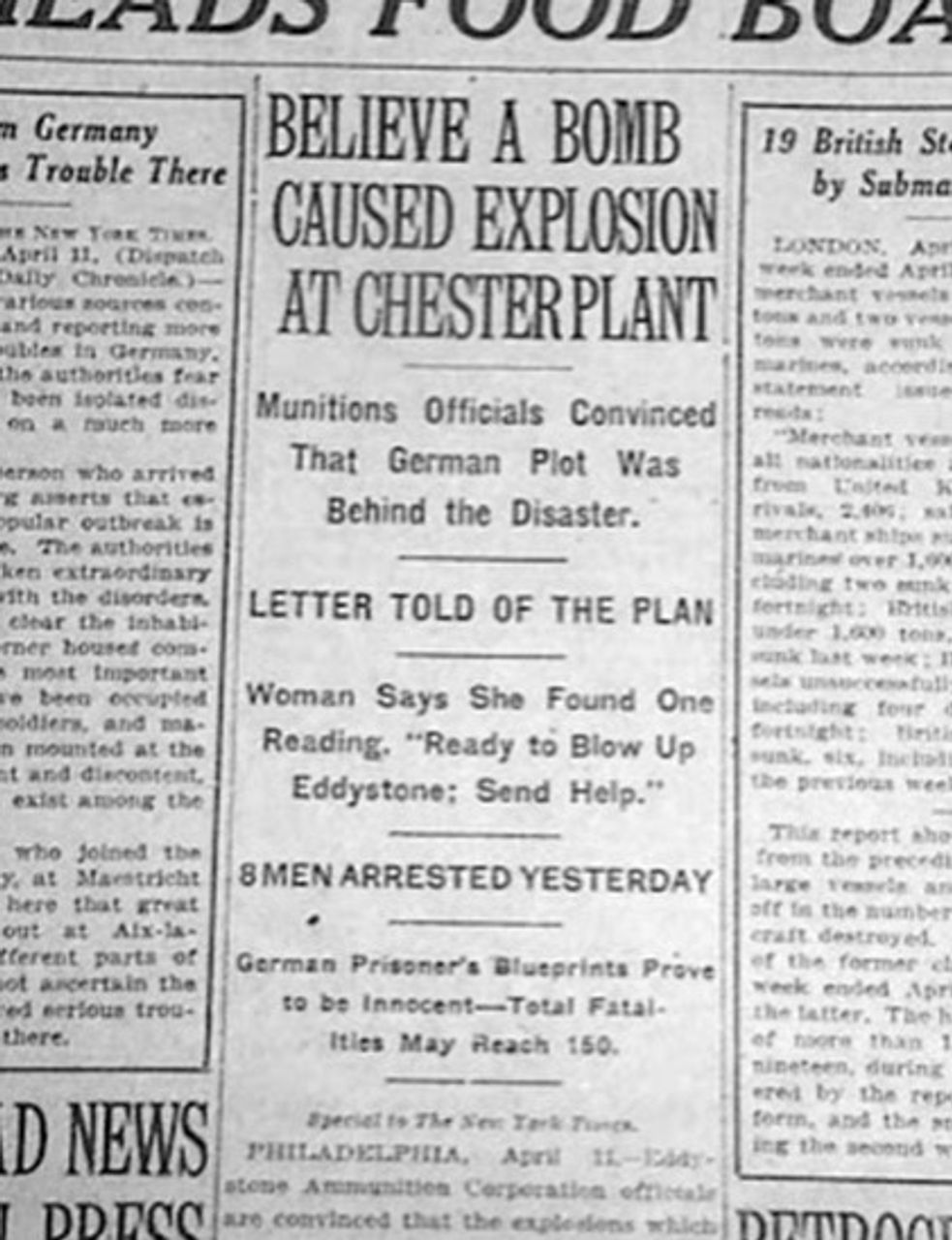 Nur Tage nach dem Eintritt der USA in den Ersten Weltkrieg kommen bei der Explosion in einer Munitionsfabrik in Eddystone, nahe Chester (Pennsylvania), 133 Arbeiter ums Leben. Fast die Hälfte der Leichen können nicht identifiziert werden; sie werden in einem Massengrab beigesetzt. Die meisten der Todesopfer sind Frauen und Mädchen. Sie waren im „F“-Flügel der Fabrik beschäftigt, wo man achtzehn Tonnen Schwarzpulver gelagert hatte. Eine unbekannte Ursache führte zur Explosion, was eine Kettenreaktion auslöste, die noch in siebzehn Kilometern Entfernung zu spüren war. Der verzweifelte Versuch, das Feuer unter Kontrolle zu bringen, verhindert immerhin, dass weitere fünfzig Tonnen Schwarzpulver in einem Lager nebenan ebenfalls explodieren.