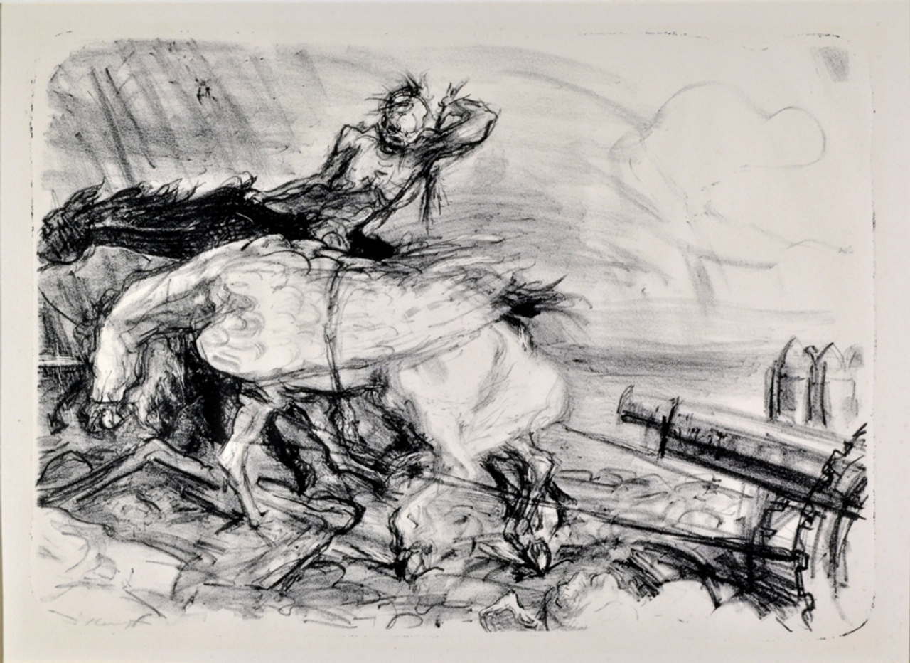 In diesem Jahr veröffentlicht der deutsche impressionistische Maler Max Slevogt (1868-1932) sein „Kriegstagebuch“mitZeichnungen und Aquarellen, sowie das Mappenwerk „Geschichte“. In beiden setzt er sich mit den Schrecken des Krieges auseinander. In dem Mappenwerk finden sich albtraumartige Lithographien wie „Die oberste Heeresleitung“: Eine an Generalfeldmarschall von Hindenburg erinnernde uniformierte Gestalt tippt mit dem Zeigefinger auf einen auf ein Podest gestellten Kopf, während Teile aus dessen entblößtem Gehirn auf den Boden geschleudert werden. Andere Lithographien tragen Titel wie „Der Traum des Siegers“, „Pegasus im Kriegsdienst“oder„Finale“.Letzteres zeigt einen knorrigen Baum, über dem ein Adler auffliegt, während ein einbeiniger Kriegsversehrter mit Krücken an mehreren aufgestellten Kreuzen vorbeihumpelt.