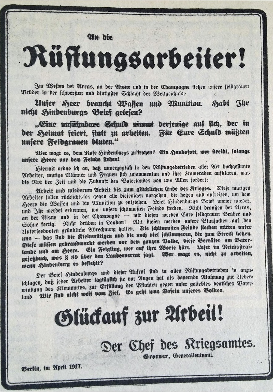 Im Westen bei Arras, an der Aisne und in der Champagne stehen unsere feldgrauen Brüder in der schwersten und blutigsten Schlacht der Weltgeschichte … Ein Hundsfott, wer streikt, solange unsere Heere vor dem Feinde stehen! Hiermit ordne ich an, dass unverzüglich in den Rüstungsbetrieben aller Art hochgesinnte Arbeiter, mutige Männer und Frauen sich zusammentun und ihre Kameraden aufklären, was die Not der Zeit und die Zukunft des Vaterlandes von uns allen fordert: Arbeit und wiederum Arbeit bis zum glücklichen Ende des Krieges … Leset Hindenburgs Brief immer wieder, und ihr werdet erkennen, wo unsere schlimmsten Feinde stecken … Die schlimmsten Feinde stecken mitten unter uns – das sind die Kleinmütigen und die noch viel Schlimmeren, die zum Streik hetzen. Diese müssen gebrandmarkt werden vor dem ganzen Volke, diese Verräter am Vaterlande und am Heere …