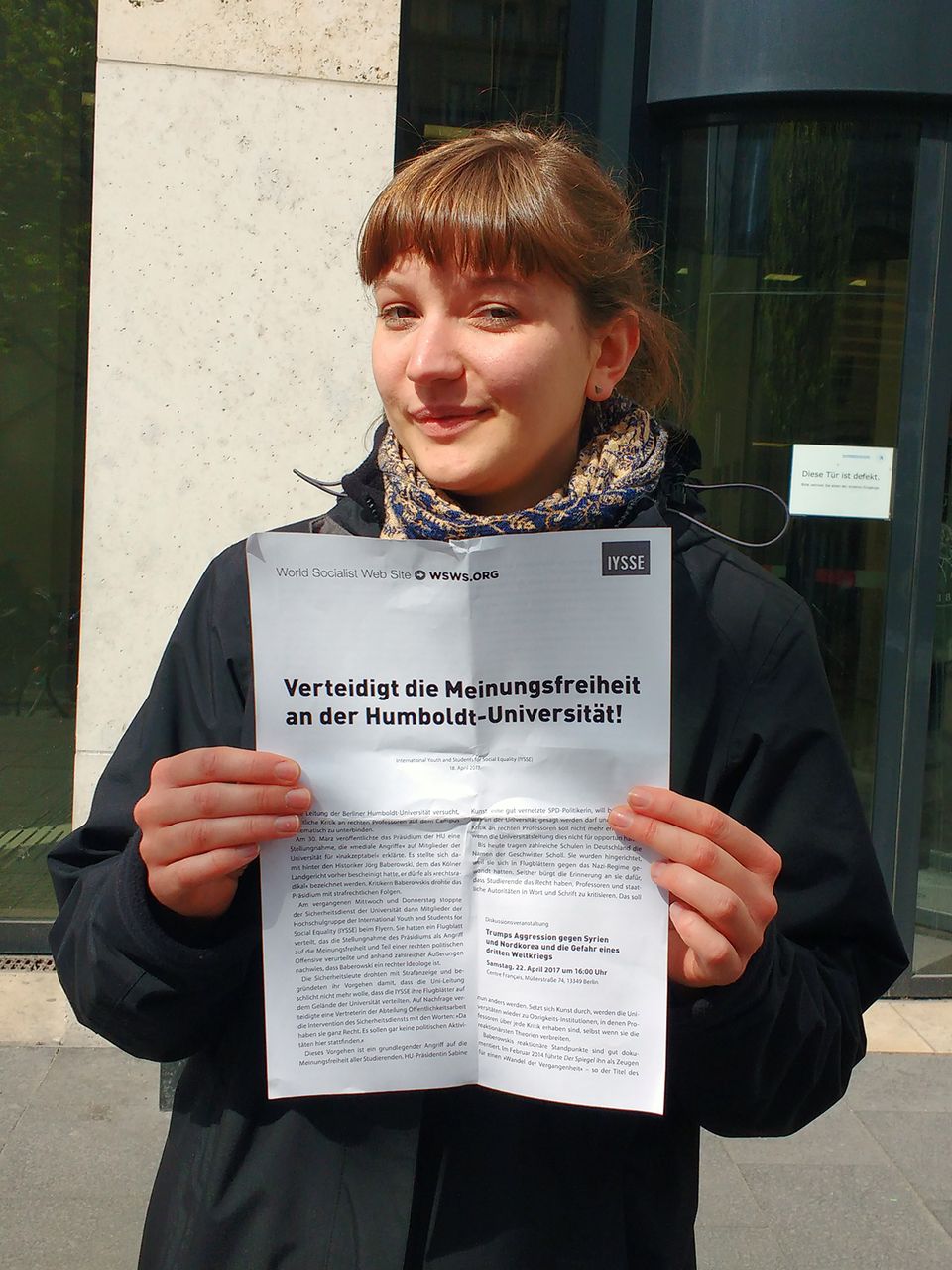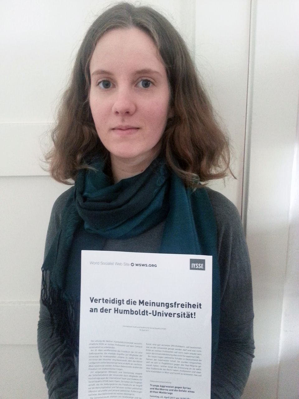 „Die Vernichtung der Juden ist eine historische Tatsache, unabhängig davon, ob man dazu bereit ist, ‚hinzusehen‘. Und das sie grausam ist, steht außer Frage. Umso wichtiger ist es, aus ihren Ursachen zu lernen und nicht das Geschehene zu relativieren“, sagt Luise. Das Verbot der Uni-Leitung, auf dem Campus zu flyern, erinnert sie „an Zeiten des Aufstiegs des NS-Regimes“. Sie sieht auch einen Zusammenhang zwischen der allgemeinen politischen Lage und der Unterstützung für rechte Professoren an den Universitäten oder der Zulassung von Bundeswehrwerbung auf dem Campus. Die Gefahr eines Dritten Weltkriegs sei „leider sehr real“. Die Arbeit der IYSSE hält Luise für „absolut unterstützenswert“, da sie sich „kritisch mit der Situation an der HU auseinandersetzt und sich gegen menschenfeindliche, kriegstreibende Aussagen des Lehrpersonals stellt“.