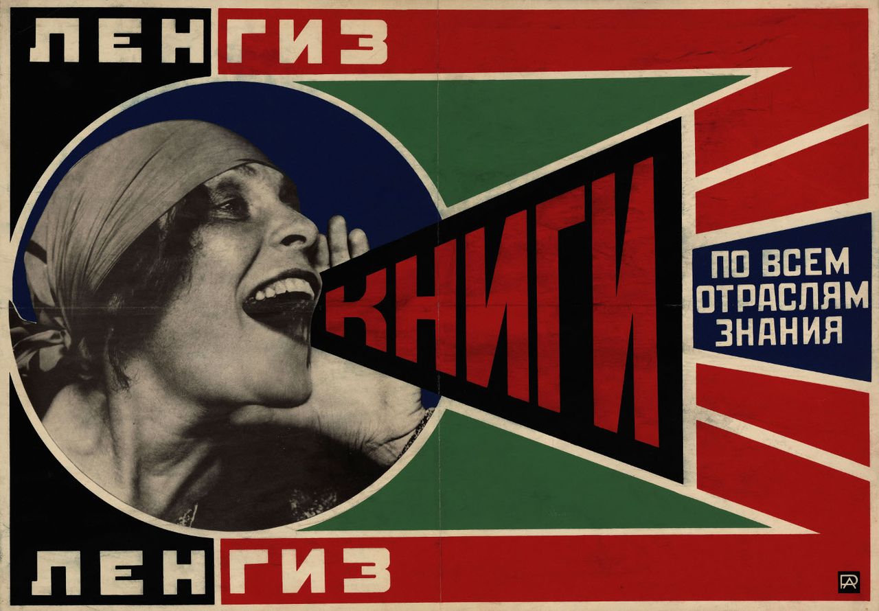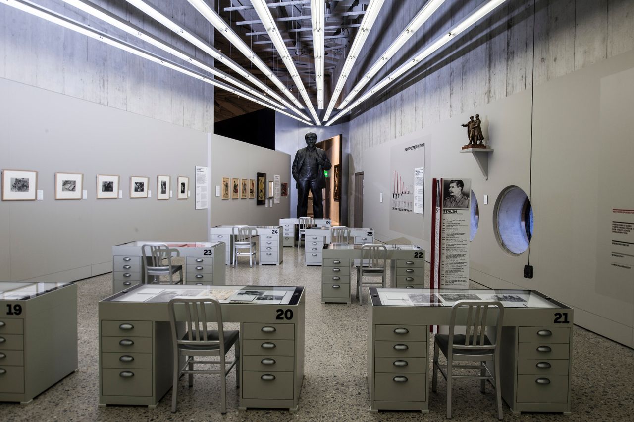 Darum herum, teilweise in besonderen Räumlichkeiten, sind herausragende Objekte der Sowjetkultur zu betrachten: eine Serie von Schwarzweißaufnahmen Alexander Rodtschenkos, daneben sein berühmtes Plakat einer Frau, die mit der Hand am Mund ausruft: „Knigi“ (Bücher), oder eine Fotomontage von Gustav Klucis. In den Kästen Kleinskulpturen und Porzellan mit Sowjetdekor. Auch ein Teller mit einem Trotzki-Portrait ist zu sehen; es ist durch Überklebung verdeckt und halb wieder sichtbar gemacht. Wir treffen auf Architekturmodelle, darunter das Modell von Wladimir Tatlins Denkmal der III. Internationale (1919-1920), sowie Filmausschnitte berühmter sowjetischer Kinofilme. Auf großer Leinwand läuft die Treppensequenz von Odessa aus Sergej Eisensteins „Panzerkreuzer Potemkin“.