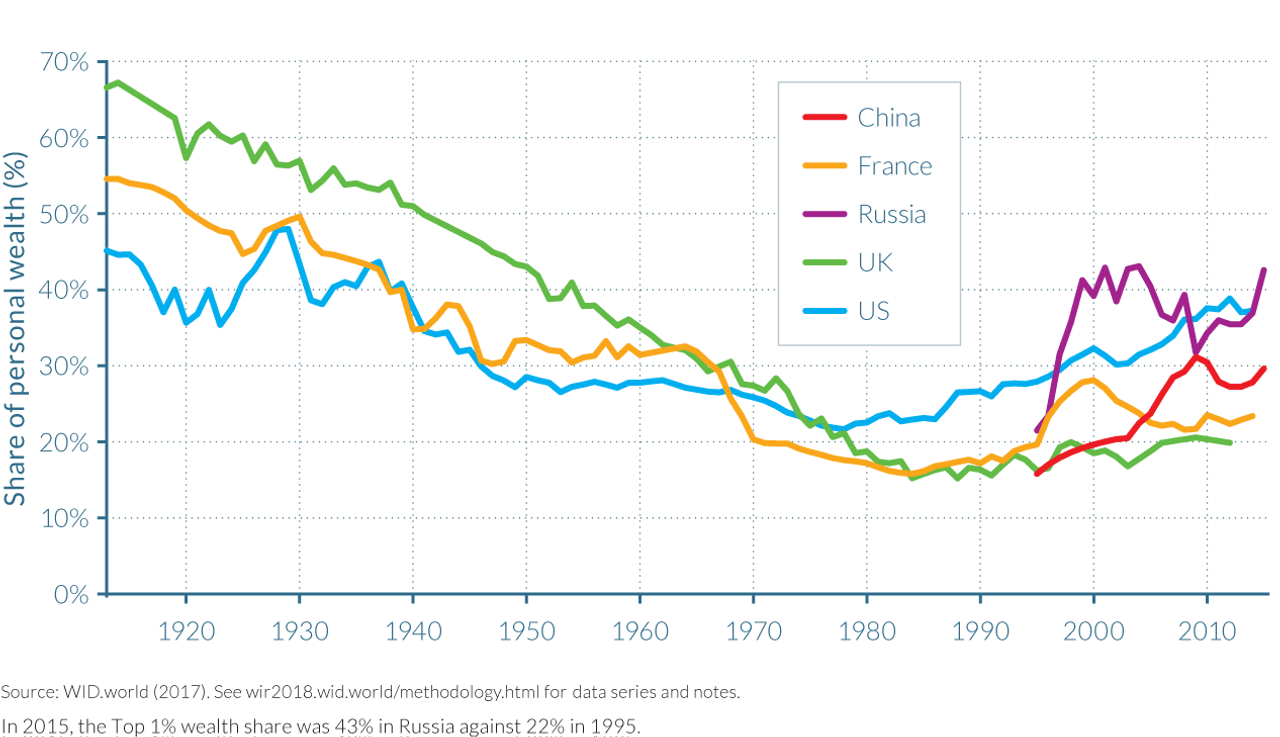 Zusätzlich hat der Bericht herausgefunden, dass die Konzentration von Reichtum in den Händen des obersten Prozents stark angestiegen ist, speziell in den USA, Russland und China. In den USA stieg der Anteil des obersten Prozents am Vermögen von 22 Prozent im Jahr 1980 auf 39 Prozent letztes Jahr. In China verdoppelte er sich von 15 auf 30 Prozent, und in Russland stieg er von 22 auf 43 Prozent.