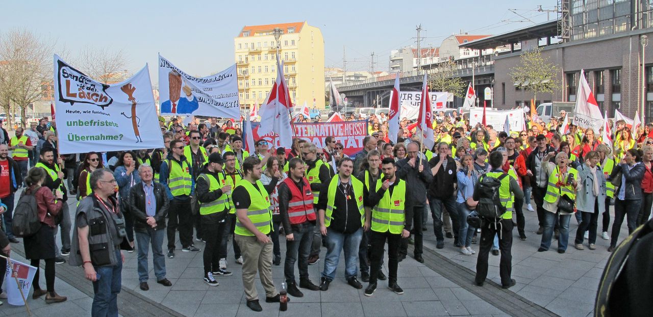 In Berlin, wo sich einige hundert Arbeiter an der Friedrichstraße versammelt haben, trifft man viele Arbeiter des Universitätskrankenhauses Charité. Christian und Stephan arbeiten dort als Kraftfahrer in der Materialverteilung. Sie gehören zu der kleinen Gruppe von Arbeitern aus dem nicht pflegerischen Bereich, die nicht in das Subunternehmen CFM ausgegliedert wurden. Deshalb haben sie etwas mehr Lohn und eine bessere Absicherung. Beide sind aber gerade deshalb auf die Demo gekommen, weil sie sich mit ihren Kollegen in der CFM solidarisieren wollen.