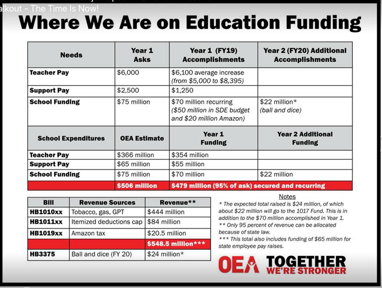 Die OEA und die kleinere Gewerkschaft Oklahoma City American Federation of Teachers (AFT) waren von Anfang an gegen den Streik. Der Streik erfolgte einzig und allein, weil nach dem neuntägigen Lehrer-Streik in West Virginia zehntausende Lehrer in den Sozialen Medien dazu aufriefen. Um die Arbeitsniederlegung im letzten Moment zu verhindern, bejubelten die Gewerkschaften einen Gesetzentwurf für höhere Löhne und eine verbesserte Sachausstattung, der sowohl von den Republikanern als auch von den Demokraten unterstützt wurde und einer Ohrfeige für die Lehrer gleichkommt, als „historisch“. Das Gesetz ändert nichts daran, dass Oklahoma hinsichtlich der Bildungsfinanzierung und der Löhne für Lehrer im Vergleich der Bundesstaaten zu den Schlusslichtern gehört.